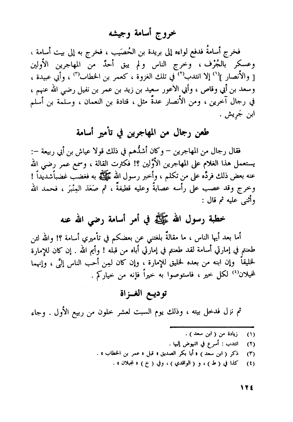 فخرج أسامة فدفع لواءه إلى بريدة بن الحصيب، فخرج به إلى بيت أسامة، وعسكر بالجرف، وخرج الناس ولم يبق أحد من المهاجرين الأولين [والأنصار] [ (1) ] إلا انتدب [ (2) ] في تلك الغزوة، كعمر بن الخطاب [ (3) ] ، وأبي عبيدة، وسعد بن أبي وقاص، وأبي الأعور سعيد بن زيد بن عمر بن نفيل رضي اللَّه عنهم، في رجال آخرين، ومن الأنصار عدة مثل، قتادة بن النعمان، وسلمة بن أسلم ابن جريش.