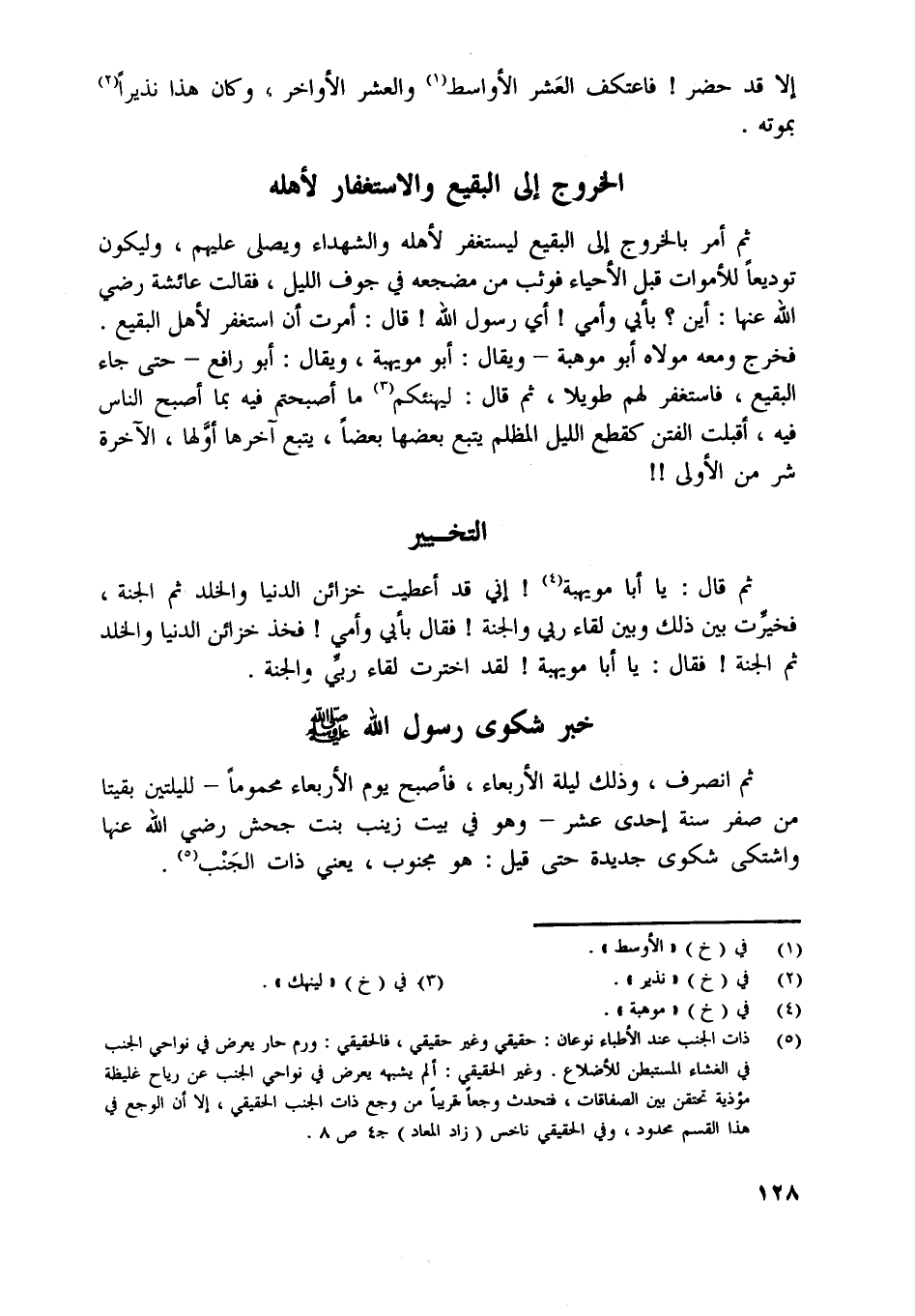ثم قال: يا أبا مويهبة [ (4) ] ! إني قد أعطيت خزائن الدنيا والخلد ثم الجنة، فخيّرت بين ذلك وبين لقاء ربي والجنة! فقال بأبي وأمي! فخذ خزائن الدنيا والخلد ثم الجنة! فقال: يا أبا مويهبة! لقد اخترت لقاء ربّي والجنة.