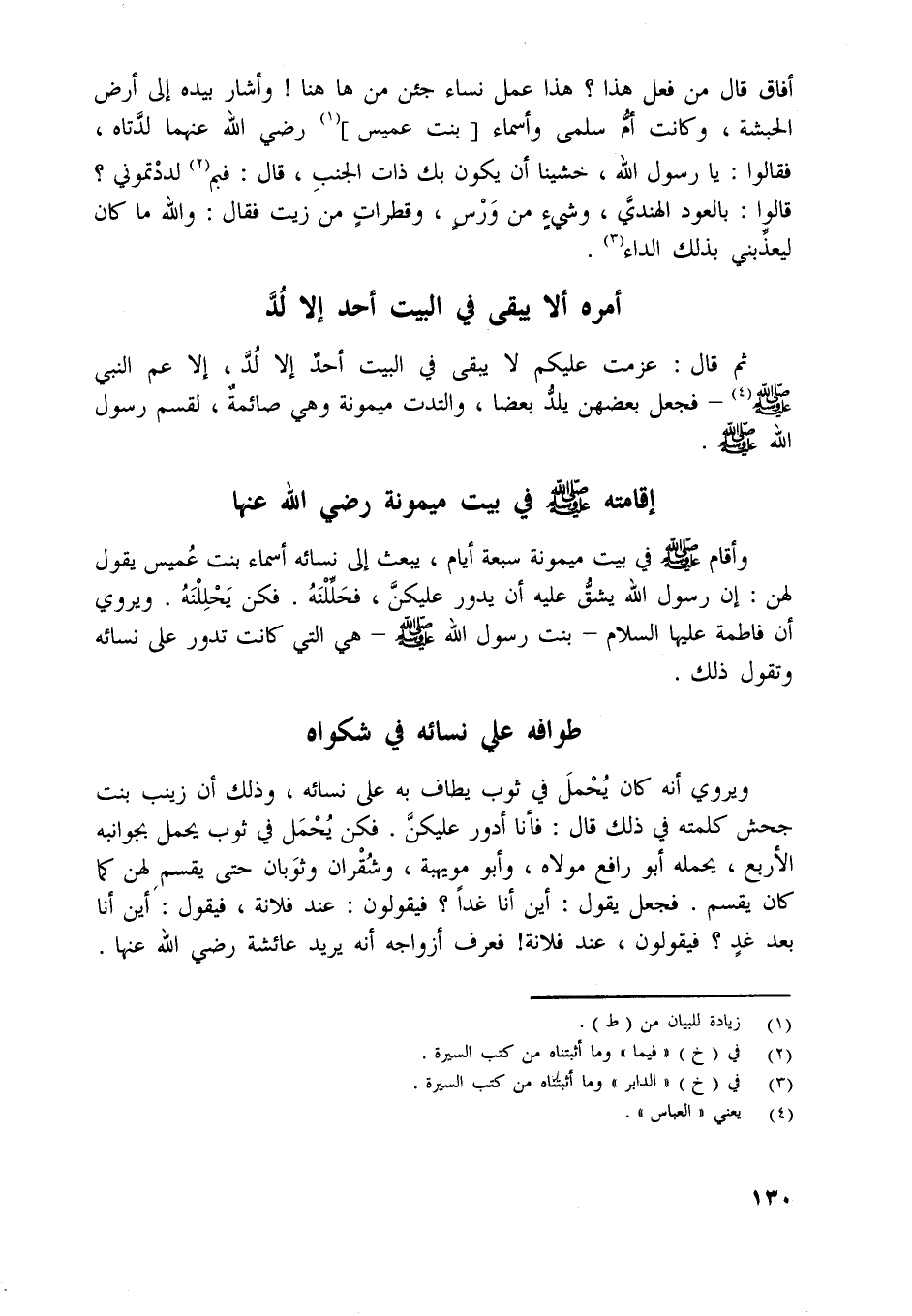 وأقام صلّى اللَّه عليه وسلّم في بيت ميمونة سبعة أيام، يبعث إلى نسائه أسماء بنت عميس يقول لهن: إن رسول اللَّه يشقّ عليه أن يدور عليكنّ، فحلّلنه. فكن يحللنه. ويروي أن فاطمة عليها السلام- بنت رسول اللَّه صلّى اللَّه عليه وسلّم- هي التي كانت تدور على نسائه وتقول ذلك.