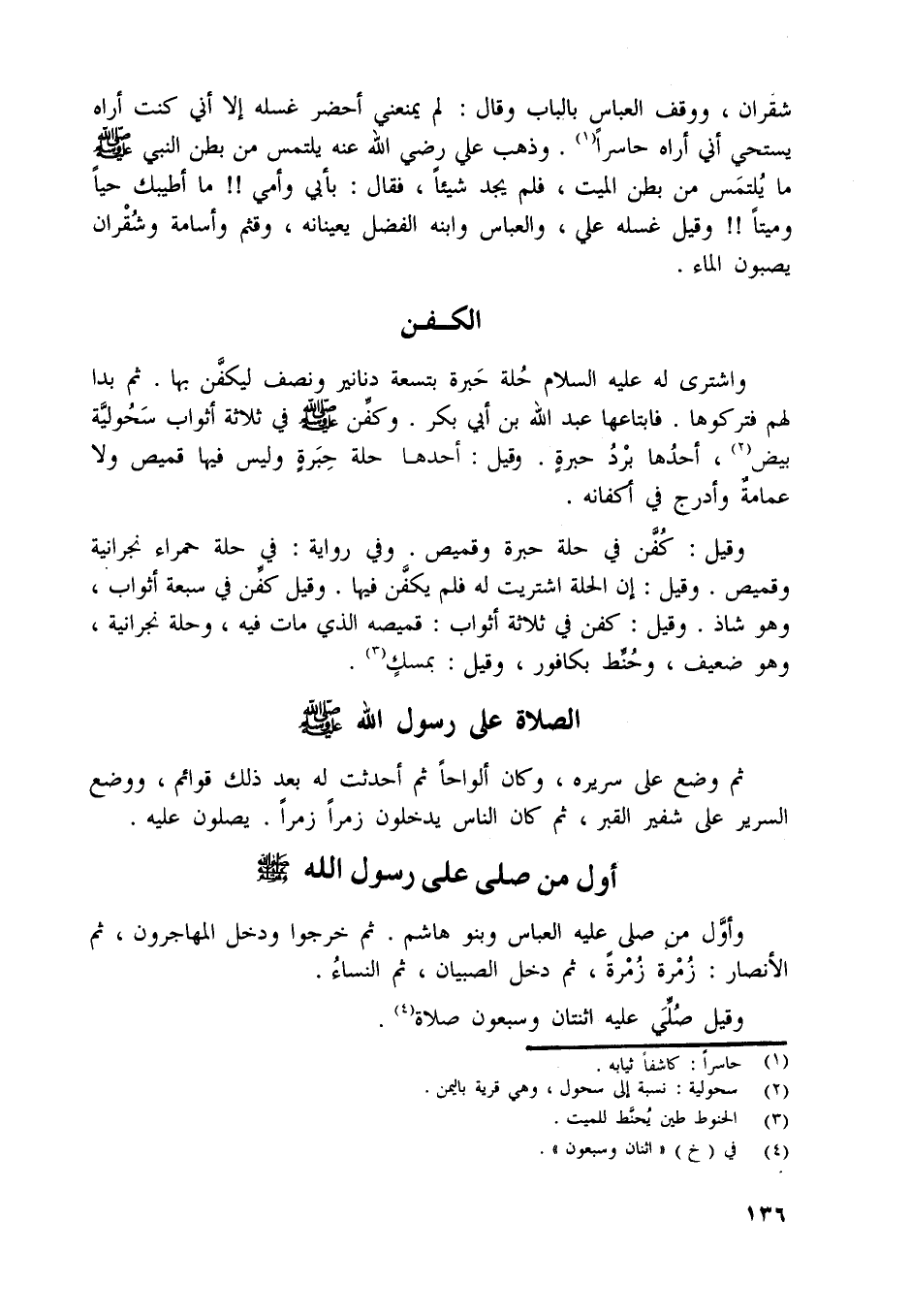 وقيل: كفّن في حلة حبرة وقميص. وفي رواية: في حلة حمراء نجرانية وقميص. وقيل: إن الحلة اشتريت له فلم يكفّن فيها. وقيل كفّن في سبعة أثواب، وهو شاذ. وقيل: كفن في ثلاثة أثواب: قميصه الّذي مات فيه، وحلة نجرانية، وهو ضعيف، وحنّط بكافور، وقيل: بمسك [ (3) ] .