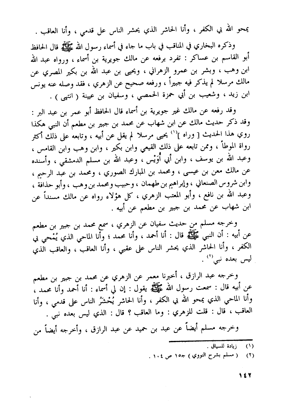 وذكره البخاري في المناقب في باب ما جاء في أسماء رسول اللَّه صلّى اللَّه عليه وسلّم قال الحافظ أبو القاسم بن عساكر: تفرد برفعه عن مالك جويرية بن أسماء، ورواه عبد اللَّه ابن وهب، وبشر بن عمرو الزهراني، ويحيى بن عبد اللَّه بن بكير المصري عن مالك مرسلا لم يذكر فيه جبيرا، ورفعه صحيح عن الزهري، فقد وصله عنه يونس ابن زيد، وشعيب بن أبي حمزة الحمصي، وسفيان بن عيينة (انتهى) .