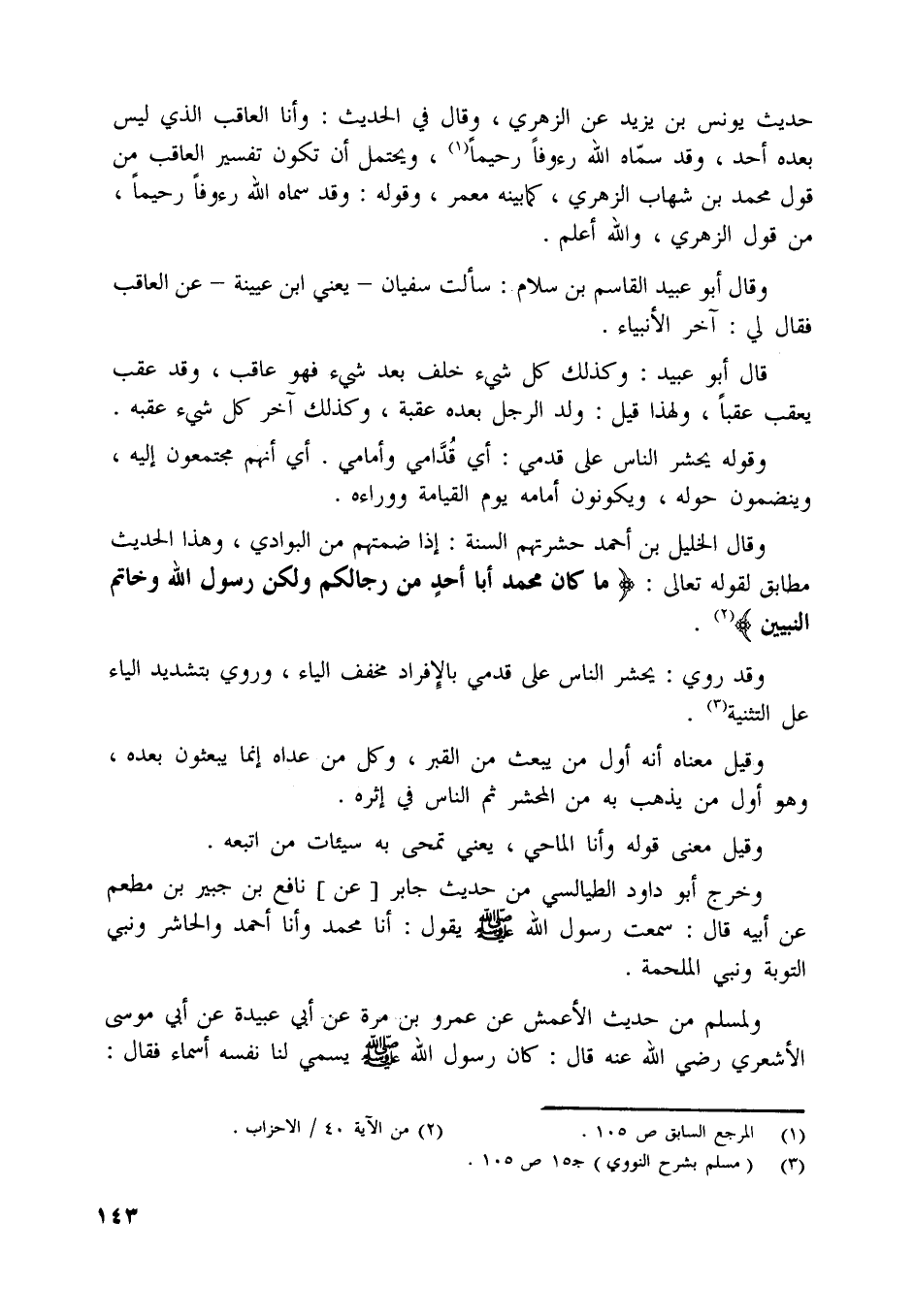 حديث يونس بن يزيد عن الزهري، وقال في الحديث: وأنا العاقب الّذي ليس بعده أحد، وقد سمّاه اللَّه رءوفا رحيما [ (1) ] ،