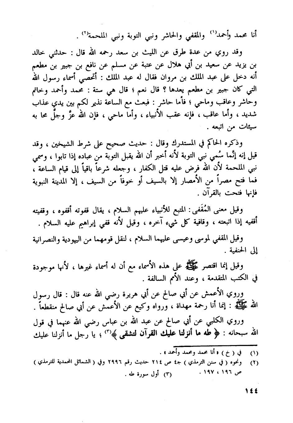 وقد روي من عدة طرق عن الليث بن سعد رحمه اللَّه قال: حدثني خالد بن يزيد عن سعيد بن أبي هلال عن عتبة عن مسلم عن نافع بن جبير بن مطعم أنه دخل على عبد الملك بن مروان فقال له عبد الملك: أتحصي أسماء رسول اللَّه التي كان جبير بن مطعم يعدها؟ قال نعم، قال هي ستة: محمد وأحمد وخاتم وحاشر وعاقب وماحي، فأما حاشر: فبعث مع الساعة نذير لكم بين يدي عذاب شديد، وأما عاقب، فإنه عقب الأنبياء، وأما ماحي، فإن اللَّه عزّ وجلّ محا به سيئات من اتبعه.
