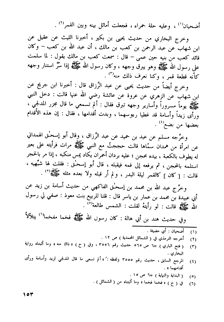 وخرج البخاري من حديث يحيى بن بكير، أخبرنا الليث عن عقيل عن ابن شهاب عن عبد الرحمن بن كعب بن مالك، أن عبد اللَّه بن كعب- وكان قائد كعب من بنيه حين عمى- قال: سمعت كعب بن مالك يقول: لما سلمت على رسول اللَّه صلّى اللَّه عليه وسلّم وهو يبرق وجهه، وكان رسول اللَّه صلّى اللَّه عليه وسلّم إذا سرّ استنار وجهه كأنه قطعة قمر، وكنا نعرف ذلك منه [ (3) ] .