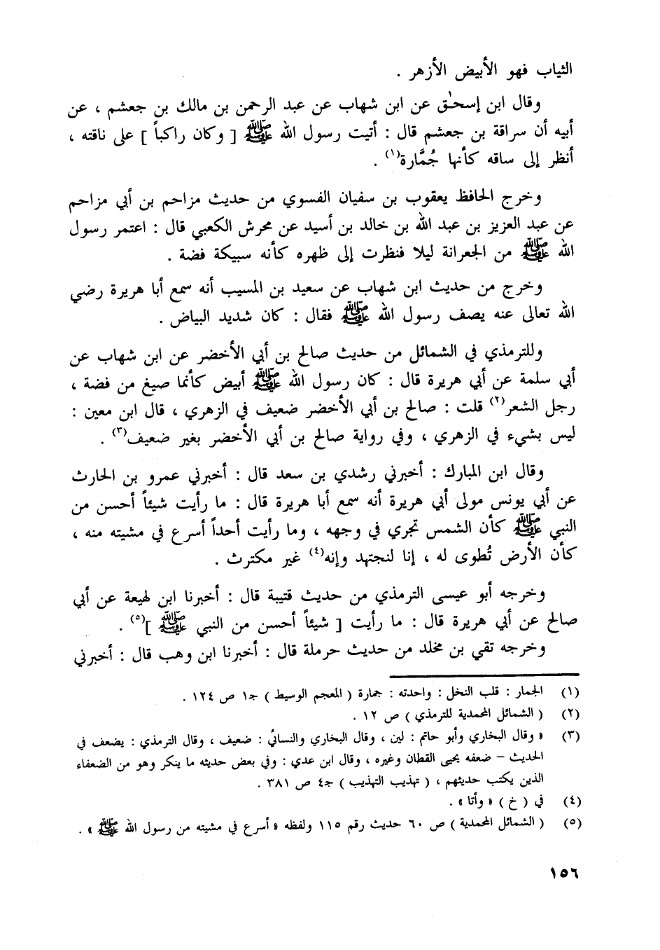 وخرج من حديث ابن شهاب عن سعيد بن المسيب أنه سمع أبا هريرة رضي اللَّه تعالى عنه يصف رسول اللَّه صلّى اللَّه عليه وسلّم فقال: كان شديد البياض.