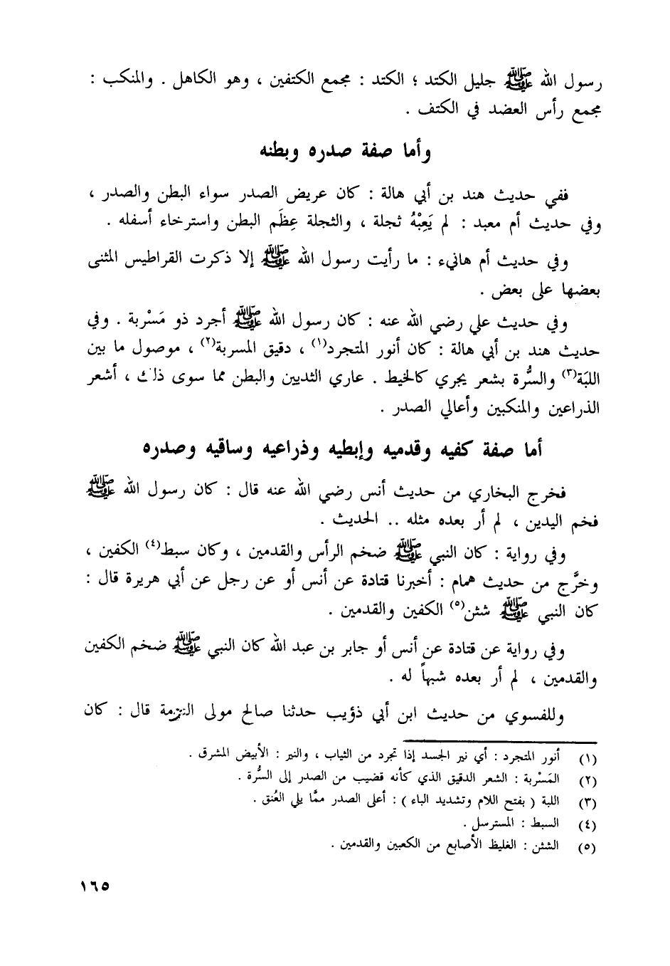 أما صفة كفيه وقدميه وإبطيه وذراعيه وساقيه وصدره
