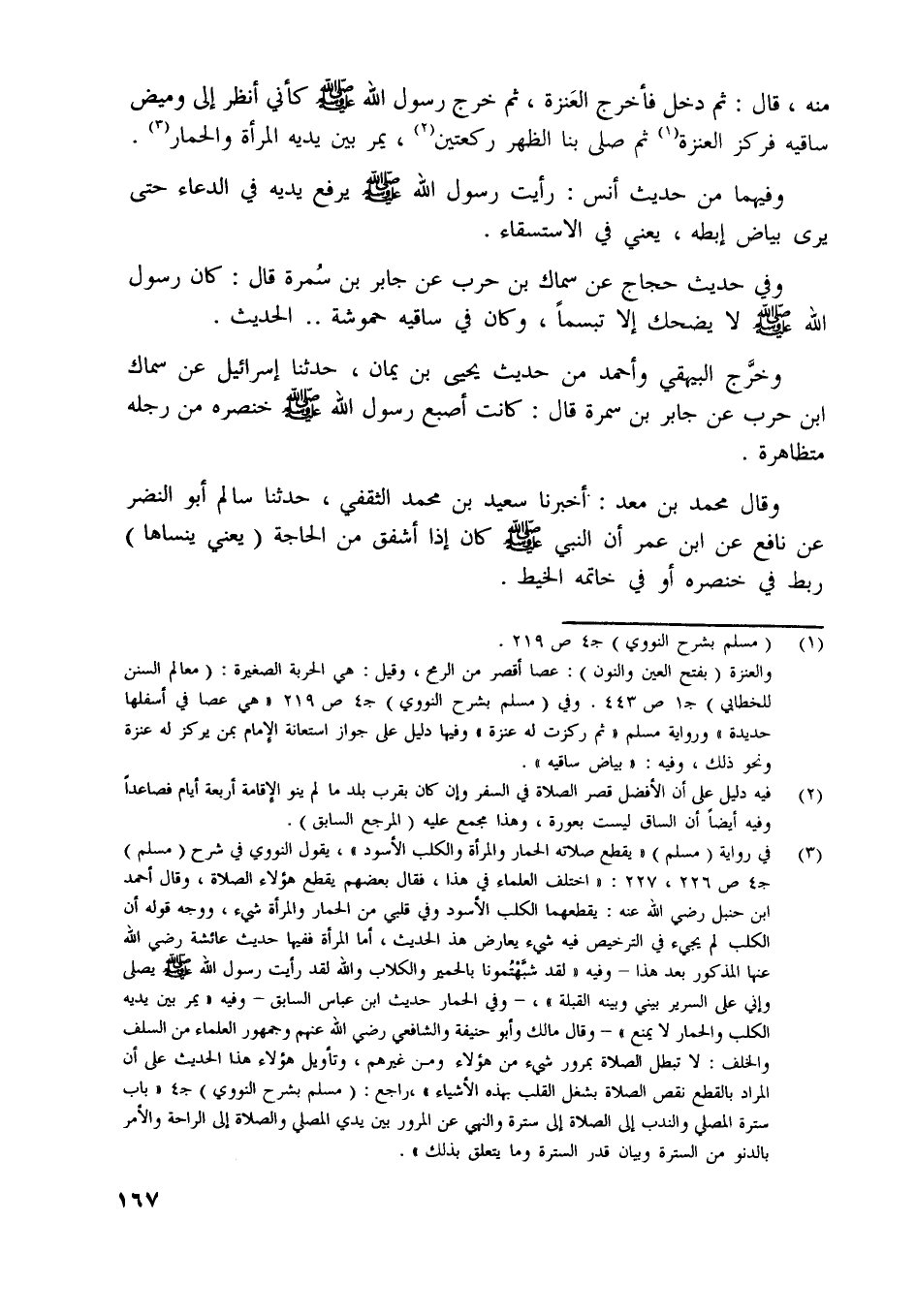 [ (3) ] في رواية (مسلم) «يقطع صلاته الحمار والمرأة والكلب الأسود» ، يقول النووي في شرح (مسلم) ج 4 ص 226، 227: «اختلف العلماء في هذا، فقال بعضهم يقطع هؤلاء الصلاة، وقال أحمد ابن حنبل رضي اللَّه عنه: يقطعهما الكلب الأسود وفي قلبي من الحمار والمرأة شيء، ووجه قوله أن الكلب لم يجيء في الترخيص فيه شيء يعارض هذا الحديث، أما المرأة ففيها حديث عائشة رضي اللَّه عنها المذكور بعد هذا- وفيه «لقد شبّهتمونا بالحمير والكلاب واللَّه لقد رأيت رسول اللَّه صلّى اللَّه عليه وسلّم يصلّى وإني على السرير بيني وبينه القبلة» ، - وفي الحمار حديث ابن عباس السابق- وفيه «يمر بين يديه الكلب والحمار لا يمنع» - وقال مالك وأبو حنيفة والشافعيّ رضي اللَّه عنهم وجمهور العلماء من السلف والخلف: لا تبطل الصلاة بمرور شيء من هؤلاء ومن غيرهم، وتأويل هؤلاء هذا الحديث على أن المراد بالقطع نقص الصلاة بشغل القلب بهذه الأشياء» ، راجع: (مسلم بشرح النووي) ج 4 «باب سترة المصلي والندب إلى الصلاة إلى سترة والنهي عن المرور بين يدي المصلي والصلاة إلى الراحة والأمر بالدنو من السترة وبيان قدر السترة وما يتعلق بذلك» .