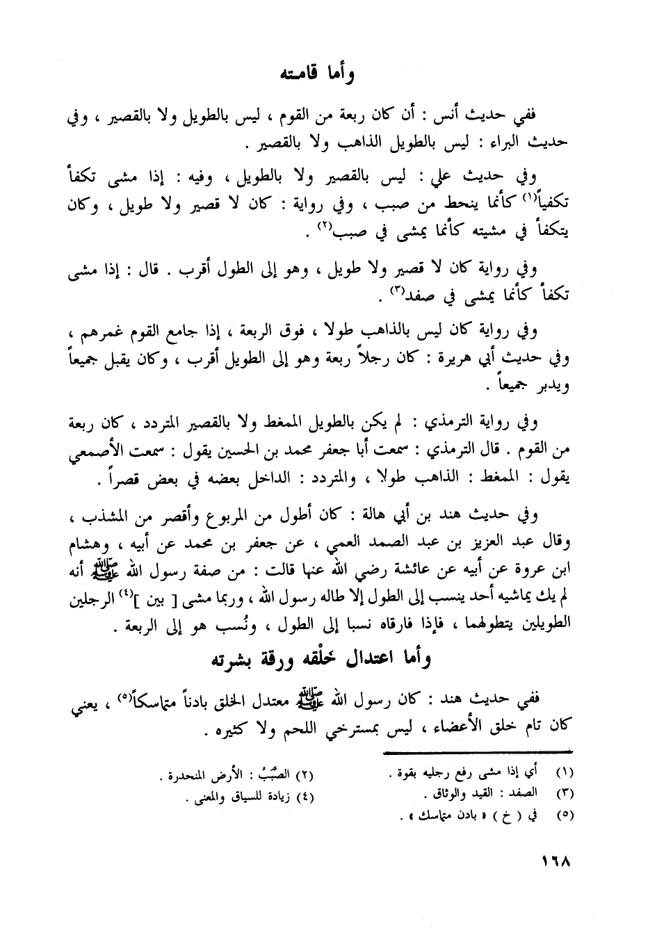 ففي حديث هند: كان رسول اللَّه صلّى اللَّه عليه وسلّم معتدل الخلق بادنا متماسكا [ (5) ] ، يعني كان تام خلق الأعضاء، ليس بمسترخي اللحم ولا كثيره.