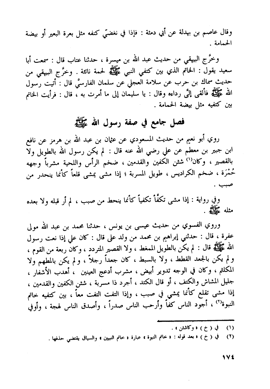 وروي الفسوي من حديث عيسى بن يونس، حدثنا محمد بن عبد اللَّه مولى عفرة، قال: حدثني إبراهيم بن محمد من ولد على قال: كان علي إذا نعت رسول اللَّه صلّى اللَّه عليه وسلّم قال: لم يكن بالطويل الممغط، ولا القصير المتردد، وكان ربعة من القوم، ولم يكن بالجعد القطط، ولا بالسبط، كان جعدا رجلا، ولم يكن بالمطهم ولا المكلثم، وكان في الوجه تدوير أبيض، مشرب أدعج العينين، أهدب الأشفار، جليل المشاش والكتف، أو قال الكتد، أجرد ذا مسربة، شثن الكفين والقدمين، إذا مشى تقلع كأنما يمشي في صبب، وإذا التفت التفت معا، بين كتفيه خاتم النبوة [ (2) ] ، أجود الناس كفا وأرحب الناس صدرا، وأصدق الناس لهجة، وأوفى