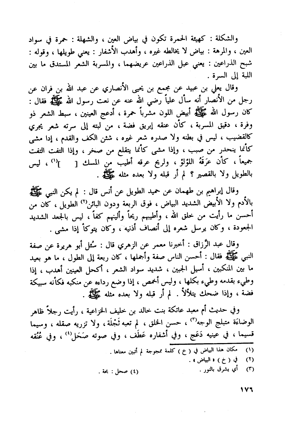 وفي حديث أم معبد عاتكة بنت خالد بن خليف الخزاعية، رأيت رجلا ظاهر الوضاءة متبلج الوجه [ (3) ] ، حسن الخلق، لم تعبه ثجلة، ولا تزريه صقله، وسيما قسيما، في عينيه دعج، وفي أشفاره عطف، وفي صوته صحل [ (4) ] ، وفي عنقه