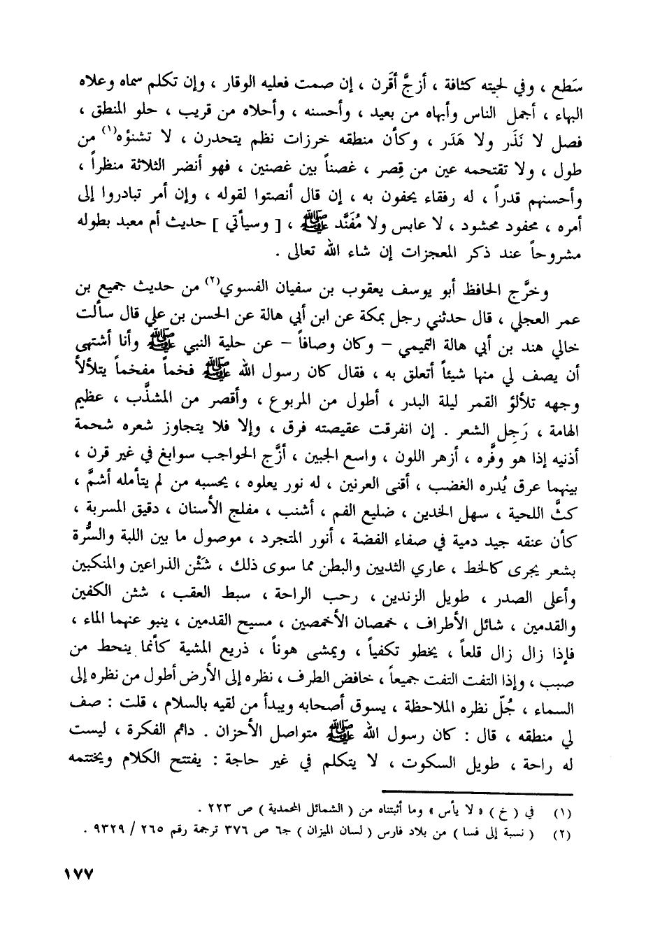 وخرّج الحافظ أبو يوسف يعقوب بن سفيان الفسوي [ (2) ] من حديث جميع بن عمر العجليّ، قال حدثني رجل بمكة عن ابن أبي هالة عن الحسن بن علي قال سألت خالي هند بن أبي هالة التميمي- وكان وصافا- عن حلية النبي صلّى اللَّه عليه وسلّم وأنا أشتهى أن يصف لي منها شيئا أتعلق به، فقال كان رسول اللَّه صلّى اللَّه عليه وسلّم فخما مفخما يتلألأ وجهه تلألؤ القمر ليلة البدر، أطول من المربوع، وأقصر من المشذّب، عظيم الهامة، رجل الشعر. إن انفرقت عقيصته فرق، وإلا فلا يتجاوز شعره شحمة أذنيه إذا هو وفّره، أزهر اللون، واسع الجبين، أزّج الحواجب سوابغ في غير قرن، بينهما عرق يدره الغضب، أقنى العرنين، له نور يعلوه، يحسبه من لم يتأمله أشمّ، كثّ اللحية، سهل الخدين، ضليع الفم، أشنب، مفلج الأسنان، دقيق المسربة، كأن عنقه جيد دمية في صفاء الفضة، أنور المتجرد، موصول ما بين اللبة والسّرة بشعر يجرى كالخط، عاري الثديين والبطن مما سوى ذلك، شثن الذراعين والمنكبين وأعلى الصدر، طويل الزندين، رحب الراحة، سبط العقب، شثن الكفين والقدمين، شائل الأطراف، خمصان الأخمصين، مسيح القدمين، ينبو عنهما الماء، فإذا زال زال قلعا، يخطو تكفيا، ويمشى هونا، ذريع المشية كأنما ينحط من صبب، وإذا التفت التفت جميعا، خافض الطرف، نظره إلى الأرض أطول من نظره إلى السماء، جلّ نظره الملاحظة، يسوق أصحابه ويبدأ من لقيه بالسلام، قلت: صف لي منطقه، قال: كان رسول اللَّه صلّى اللَّه عليه وسلّم متواصل الأحزان. دائم الفكرة، ليست له راحة، طويل السكوت، لا يتكلم في غير حاجة: يفتتح الكلام ويختتمه