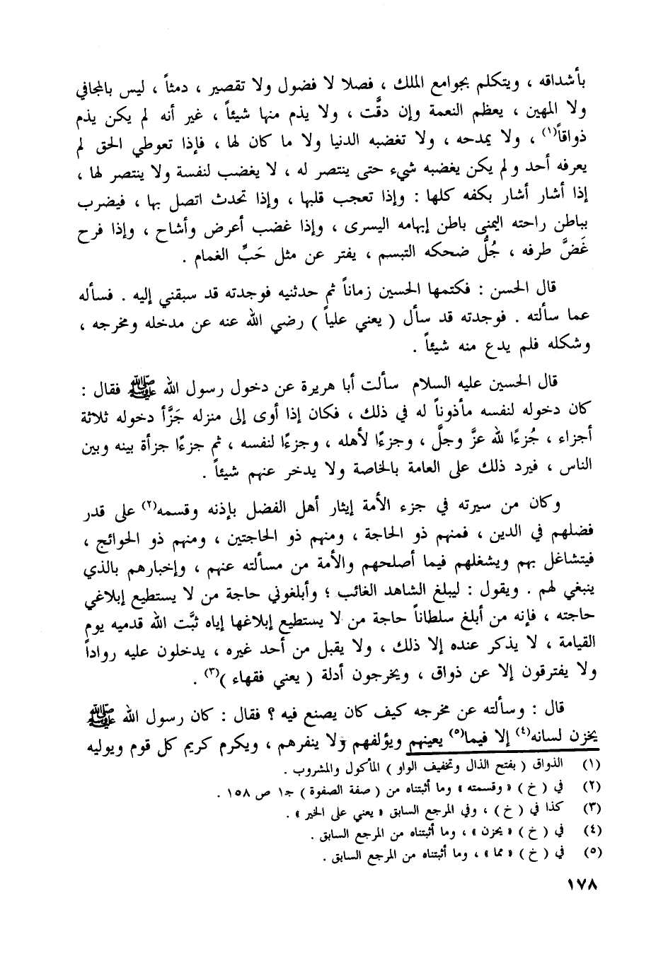 قال: وسألته عن مخرجه كيف كان يصنع فيه؟ فقال: كان رسول اللَّه صلّى اللَّه عليه وسلّم يخزن لسانه [ (4) ] إلا فيما [ (5) ] يعينهم ويؤلفهم ولا ينفرهم، ويكرم كريم كل قوم ويوليه