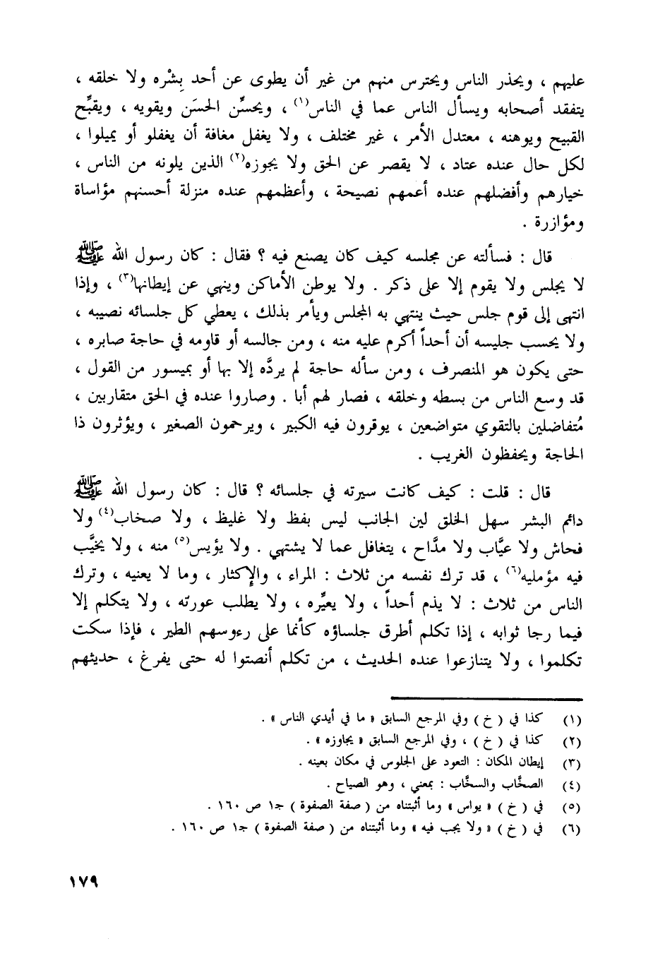 قال: فسألته عن مجلسه كيف كان يصنع فيه؟ فقال: كان رسول اللَّه صلّى اللَّه عليه وسلّم لا يجلس ولا يقوم إلا على ذكر. ولا يوطن الأماكن وينهي عن إيطانها [ (3) ] ، وإذا انتهى إلى قوم جلس حيث ينتهي به المجلس ويأمر بذلك، يعطي كل جلسائه نصيبه، ولا يحسب جليسه أن أحدا أكرم عليه منه، ومن جالسه أو قاومه في حاجة صابره، حتى يكون هو المنصرف، ومن سأله حاجة لم يردّه إلا بها أو بميسور من القول، قد وسع الناس من بسطه وخلقه، فصار لهم أبا. وصاروا عنده في الحق متقاربين، متفاضلين بالتقوى متواضعين، يوقرون فيه الكبير، ويرحمون الصغير، ويؤثرون ذا الحاجة ويحفظون الغريب.