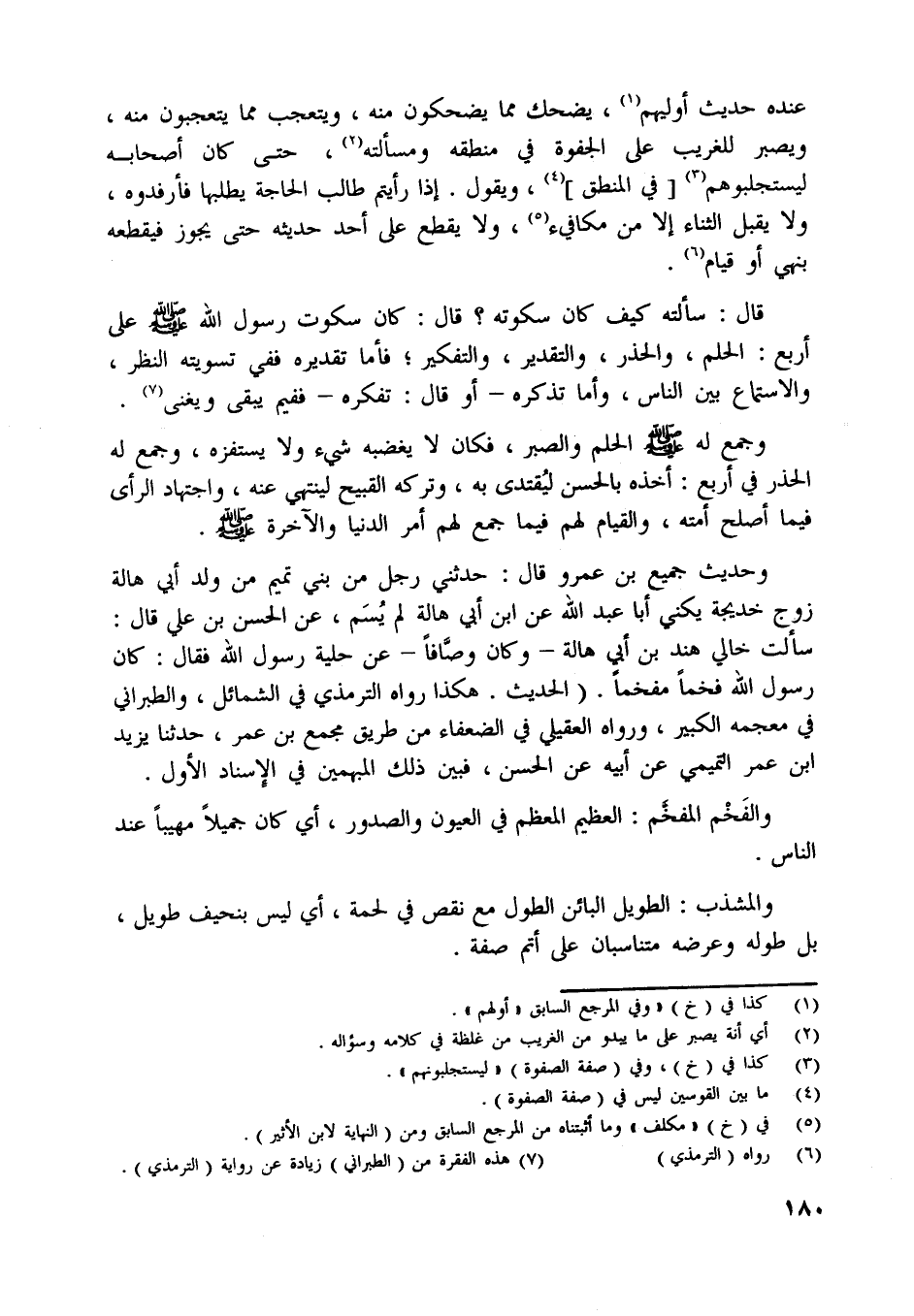 سألت خالي هند بن أبي هالة- وكان وصّافا- عن حلية رسول اللَّه فقال: كان رسول اللَّه فخما مفخما. (الحديث. هكذا رواه الترمذي في الشمائل، والطبراني في معجمه الكبير، ورواه العقيلي في الضعفاء من طريق مجمع بن عمر، حدثنا يزيد ابن عمر التميمي عن أبيه عن الحسن،