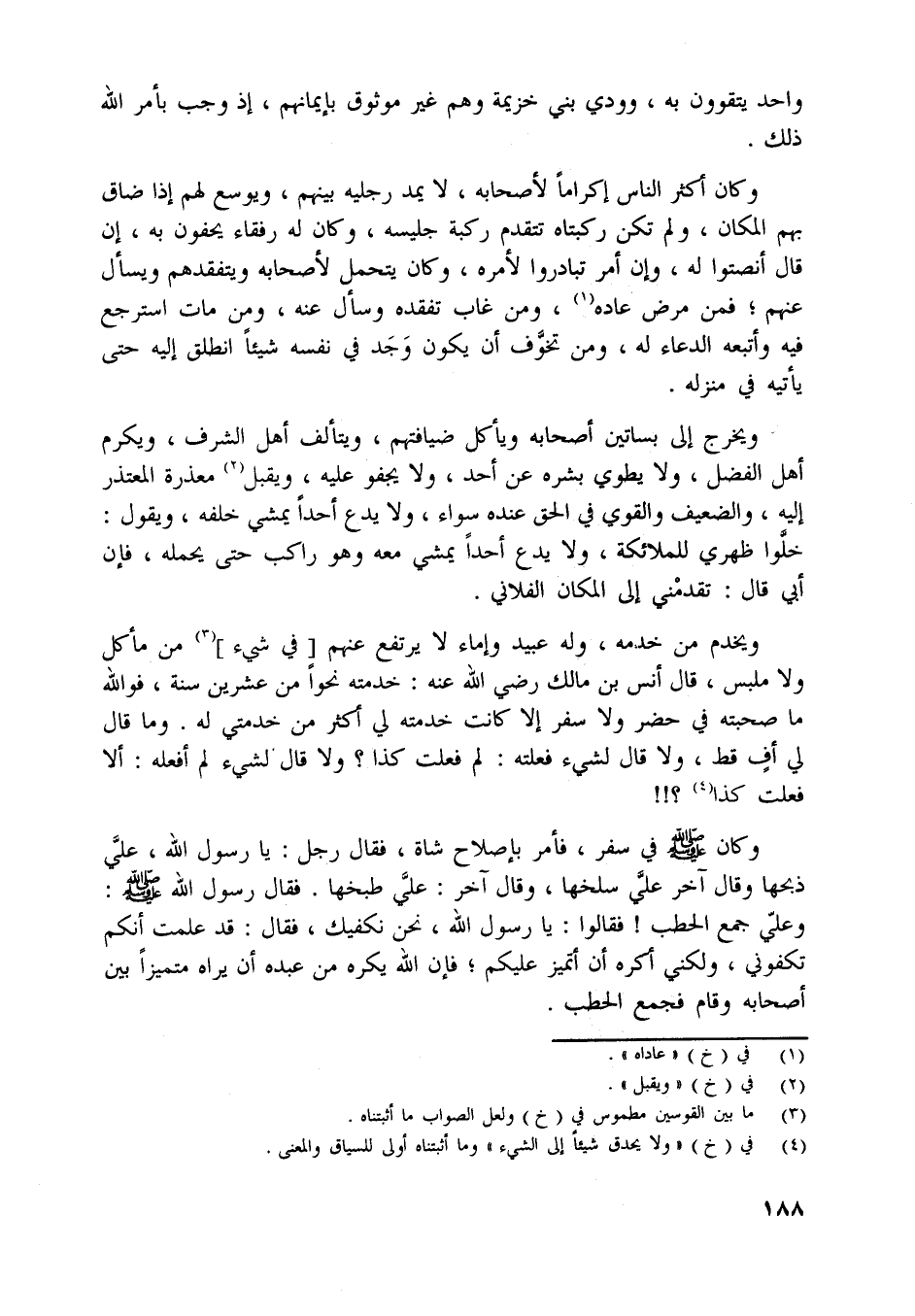 وكان أكثر الناس إكراما لأصحابه، لا يمد رجليه بينهم، ويوسع لهم إذا ضاق بهم المكان، ولم تكن ركبتاه تتقدم ركبة جليسه، وكان له رفقاء يحفون به، إن قال أنصتوا له، وإن أمر تبادروا لأمره، وكان يتحمل لأصحابه ويتفقدهم ويسأل عنهم، فمن مرض عاده [ (1) ] ، ومن غاب تفقده وسأل عنه، ومن مات استرجع فيه وأتبعه الدعاء له، ومن تخوّف أن يكون وجد في نفسه شيئا انطلق إليه حتى يأتيه في منزله.