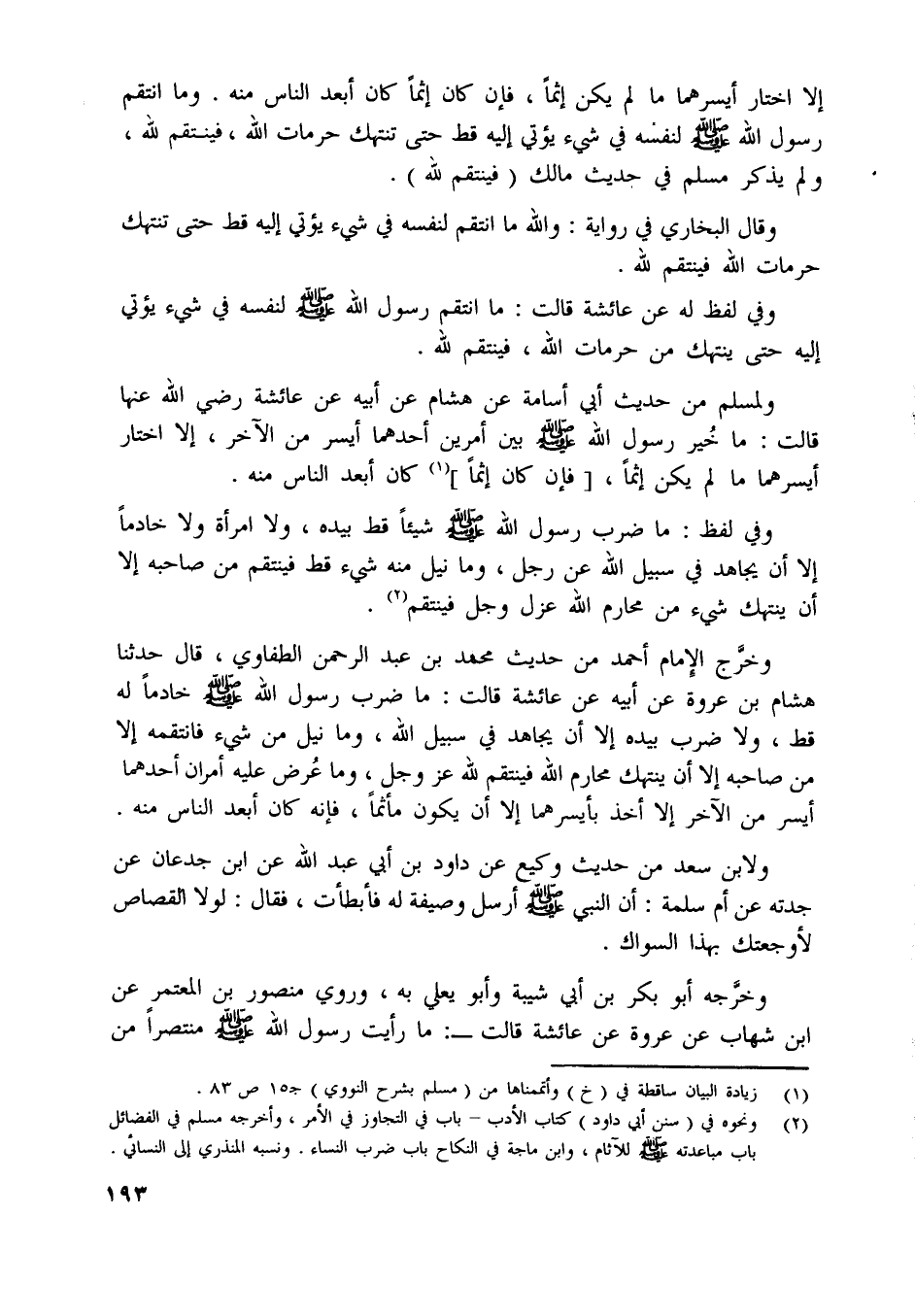 وخرّج الإمام أحمد من حديث محمد بن عبد الرحمن الطفاوي، قال حدثنا هشام بن عروة عن أبيه عن عائشة قالت: ما ضرب رسول اللَّه صلّى اللَّه عليه وسلّم خادما له قط، ولا ضرب بيده إلا أن يجاهد في سبيل اللَّه، وما نيل من شيء فانتقمه إلا من صاحبه إلا أن ينتهك محارم اللَّه فينتقم للَّه عز وجل، وما عرض عليه أمران أحدهما أيسر من الآخر إلا أخذ بأيسرهما إلا أن يكون مأثما، فإنه كان أبعد الناس منه.