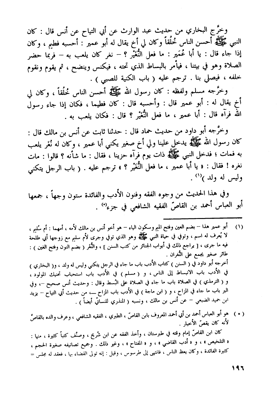 وخرّجه مسلم ولفظه: كان رسول اللَّه صلّى اللَّه عليه وسلّم أحسن الناس خلقا، وكان لي أخ يقال له: أبو عمير قال: وأحسبه قال: كان فطيما، فكان إذا جاء رسول اللَّه فرآه قال: أبا عمير، ما فعل النّغير؟ قال: فكان يلعب به.