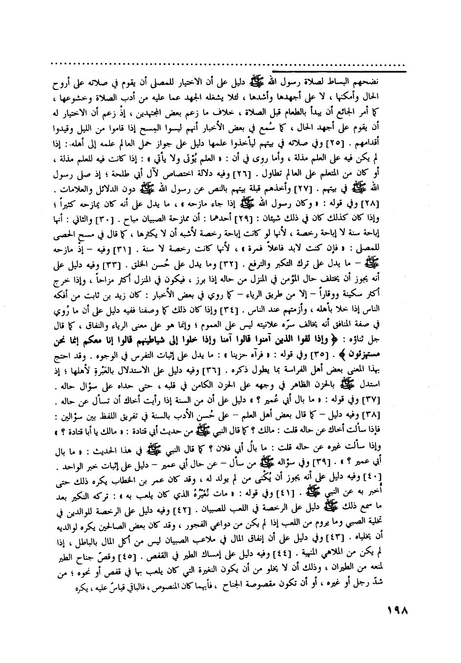 [ () ] نضحهم البساط لصلاة رسول اللَّه صلّى اللَّه عليه وسلّم دليل على أن الاختيار للمصلى أن يقوم في صلاته على أروح الحال وأمكنها، لا على أجهدها وأشدها، لئلا يشغله الجهد عما عليه من أدب الصلاة وخشوعها، كما أمر الجائع أن يبدأ بالطعام قبل الصلاة، خلاف ما زعم بعض المجتهدين، إذ زعم أن الاختيار له أن يقوم على أجهد الحال، كما سمع في بعض الأخبار أنهم لبسوا المسح إذا قاموا من الليل وقيدوا أقدامهم. [25] وفي صلاته في بيتهم ليأخذوا علمها دليل على جواز حمل العالم علمه إلى أهله: إذا لم يكن فيه على العلم مذلة، وأما روى في أن: «العلم يؤتى ولا يأتي» : إذا كانت فيه للعلم مذلة، أو كان من المتعلم على العالم تطاول. [26] وفيه دلالة اختصاص لآل أبي طلحة، إذ صلى رسول اللَّه صلّى اللَّه عليه وسلّم في بيتهم. [27] وأخذهم قبلة بيتهم بالنص عن رسول اللَّه صلّى اللَّه عليه وسلّم دون الدلائل والعلامات.