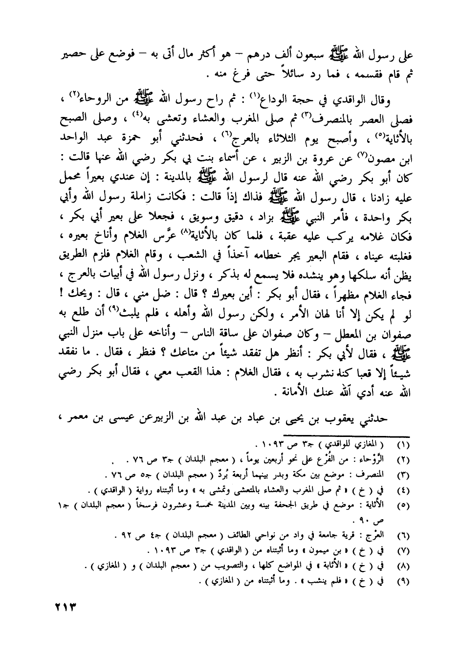 وقال الواقدي في حجة الوداع [ (1) ] : ثم راح رسول اللَّه صلّى اللَّه عليه وسلّم من الروحاء [ (2) ] ، فصلّى العصر بالمنصرف [ (3) ] ثم صلّى المغرب والعشاء وتعشى به [ (4) ] ، وصلّى الصبح بالأثاية [ (5) ] ، وأصبح يوم الثلاثاء بالعرج [ (6) ] ،