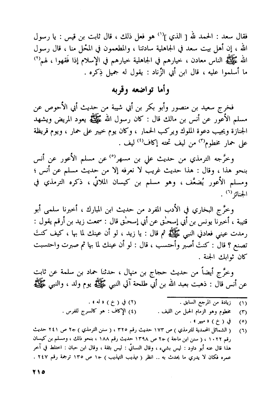 [ (6) ] (الشمائل المحمدية للترمذي) ص 173 حديث رقم 325، (سنن الترمذي) ج 2 ص 241 حديث رقم 1022، (سنن ابن ماجة) ج 2 ص 1398 حديث رقم 188، بنحو ذلك، ومسلم بن كيسان هذا قال عنه أبو داود: ليس بشيء، وقال النسائي: ليس بثقة، وقال ابن حبان: اختلط في آخر عمره فكان لا يدري ما يحدث به.. انظر (تهذيب التهذيب) ج 1 ص 135 ترجمة رقم 247.