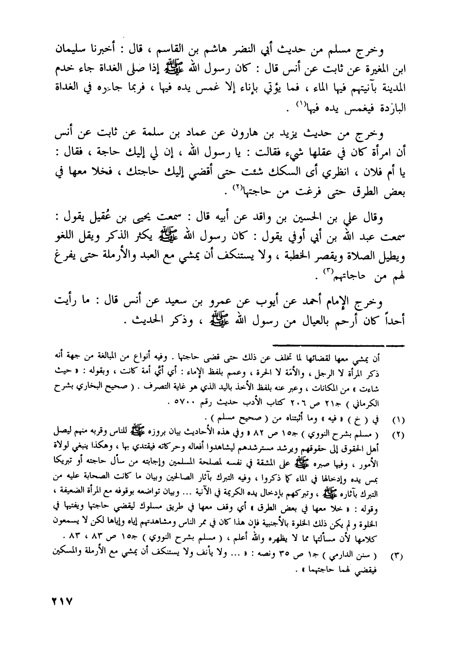 [ (2) ] (مسلم بشرح النووي) ج 15 ص 82 «وفي هذه الأحاديث بيان بروزه صلّى اللَّه عليه وسلّم للناس وقربه منهم ليصل أهل الحقوق إلى حقوقهم ويرشد مسترشدهم ليشاهدوا أفعاله وحركاته فيقتدي بها، وهكذا ينبغي لولاة الأمور، وفيها صبره صلّى اللَّه عليه وسلّم على المشقة في نفسه لمصلحة المسلمين وإجابته من سأل حاجته أو تبريكا بمس يده وإدخالها في الماء كما ذكروا، وفيه التبرك بآثار الصالحين وبيان ما كانت الصحابة عليه من التبرك بآثاره صلّى اللَّه عليه وسلّم، وتبركهم بإدخال يده الكريمة في الآنية ... وبيان تواضعه بوقوفه مع المرأة الضعيفة، وقوله: «خلا معها في بعض الطرق» أي وقف معها في طريق مسلوك ليقضي حاجتها ويفتيها في الخلوة ولم يكن ذلك الخلوة بالأجنبية فإن هذا كان في ممر الناس ومشاهدتهم إياه وإياها لكن لا يسمعون كلامها لأن مسألتها مما لا يظهره واللَّه أعلم، (مسلم بشرح النووي) ج 15 ص 83، 83.