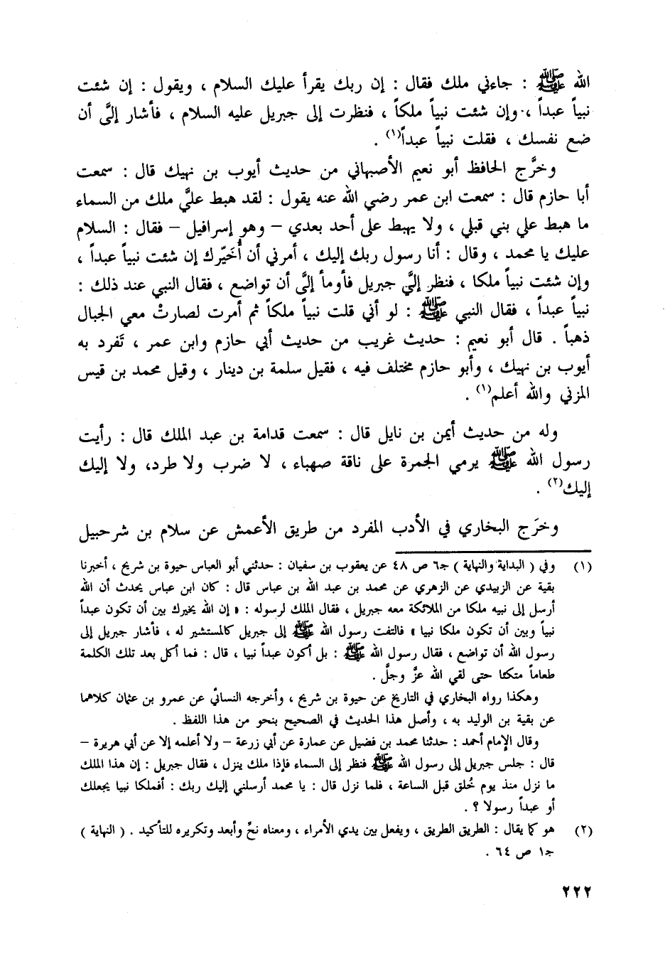 وفي (البداية والنهاية) ج 6 ص 48 عن يعقوب بن سفيان: حدثني أبو العباس حيوة بن شريح، أخبرنا بقية عن الزبيدي عن الزهري عن محمد بن عبد اللَّه بن عباس قال: كان ابن عباس يحدث أن اللَّه أرسل إلى نبيه ملكا من الملائكة معه جبريل، فقال الملك لرسوله: «إن اللَّه يخيرك بين أن تكون عبدا نبيا وبين أن تكون ملكا نبيا» فالتفت رسول اللَّه صلّى اللَّه عليه وسلّم إلى جبريل كالمستشير له، فأشار جبريل إلى رسول اللَّه أن تواضع، فقال رسول اللَّه صلّى اللَّه عليه وسلّم: بل أكون عبدا نبيا، قال: فما أكل بعد تلك الكلمة طعاما متكئا حتى لقي اللَّه عزّ وجلّ.