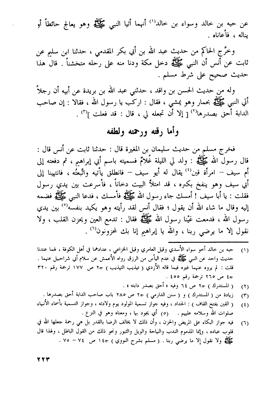 قال رسول اللَّه صلّى اللَّه عليه وسلّم: ولد لي الليلة غلام فسميته باسم أبي إبراهيم، ثم دفعته إلى أم سيف- امرأة قين [ (4) ] يقال له أبو سيف- فانطلق يأتيه واتّبعته، فانتيهنا إلى أبي سيف وهو ينفخ بكيره، قد امتلأ البيت دخانا، فأسرعت بين يدي رسول فقلت: يا أبا سيف! أمسك جاء رسول اللَّه صلّى اللَّه عليه وسلّم فأمسك، فدعا النبي صلّى اللَّه عليه وسلّم فضمه إليه وقال ما شاء اللَّه أن يقول، فقال أنس لقد رأيته وهو يكيد بنفسه [ (5) ] بين يدي رسول اللَّه، فدمعت عينا رسول اللَّه صلّى اللَّه عليه وسلّم فقال: تدمع العين ويحزن القلب، ولا نقول إلا ما يرضي ربنا، واللَّه يا إبراهيم إنا بك لمحزونون [ (6) ] .