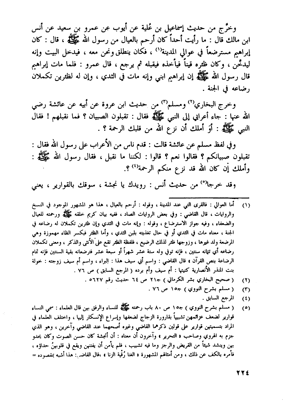 وخرج البخاري [ (2) ] ومسلم [ (3) ] من حديث ابن عروة عن أبيه عن عائشة رضي اللَّه عنها: جاء أعرابي إلى النبي صلّى اللَّه عليه وسلّم فقال: تقبلون الصبيان؟ فما نقبلهم! فقال النبي صلّى اللَّه عليه وسلّم: أو أملك أن نزع اللَّه من قلبك الرحمة؟.