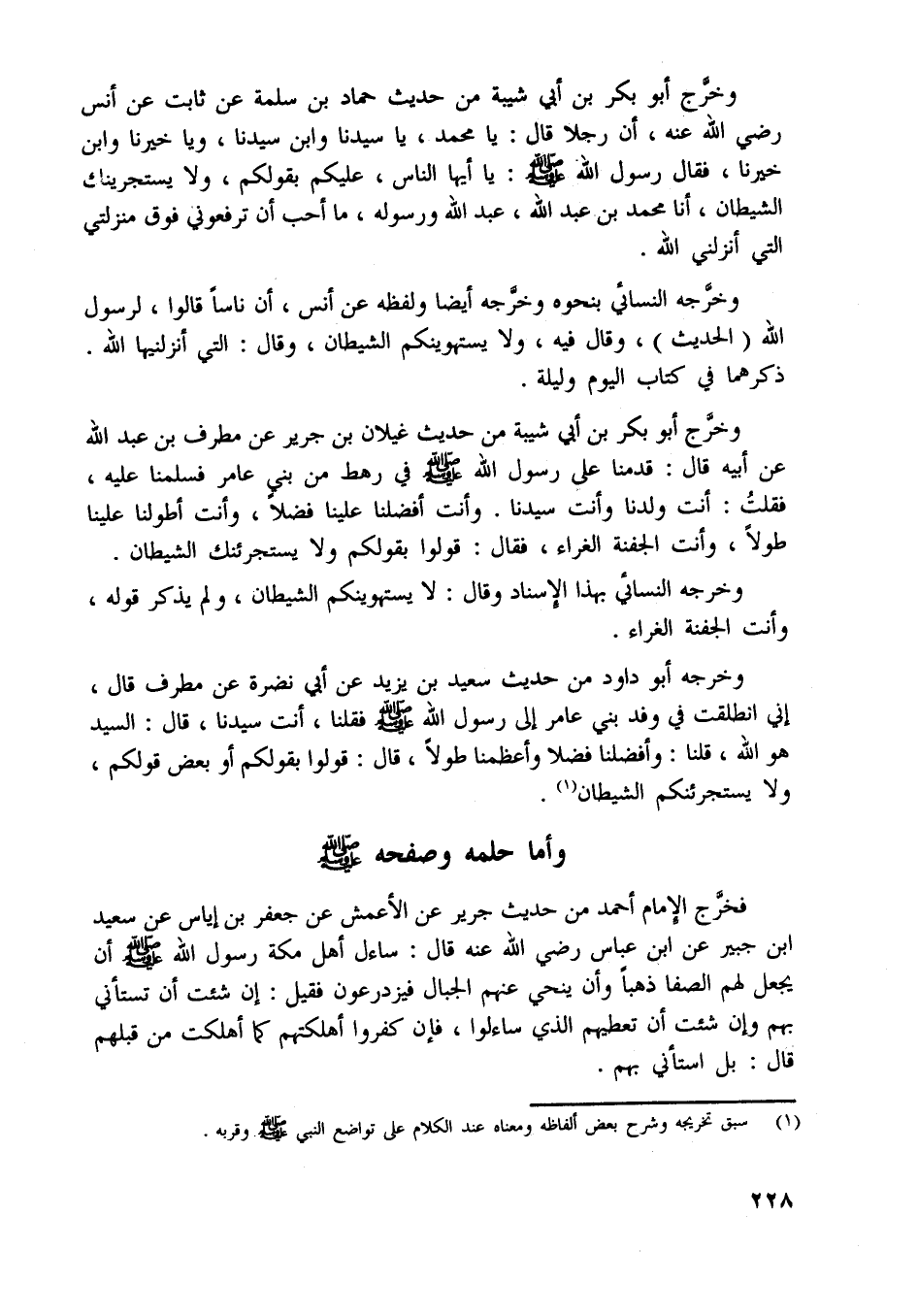 وخرّج أبو بكر بن أبي شيبة من حديث حماد بن سلمة عن ثابت عن أنس رضي اللَّه عنه، أن رجلا قال: يا محمد، يا سيدنا وابن سيدنا، ويا خيرنا وابن خيرنا، فقال رسول اللَّه صلّى اللَّه عليه وسلّم: يا أيها الناس، عليكم بقولكم، ولا يستجرينك الشيطان، أنا محمد بن عبد اللَّه، عبد اللَّه ورسوله، ما أحب أن ترفعوني فوق منزلتي التي أنزلني اللَّه.