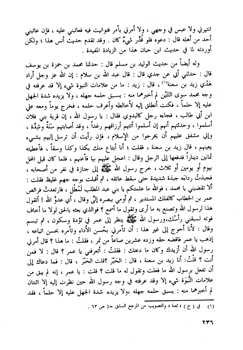 فقلت: ما هذا؟ قال أمرني رسول اللَّه أن أزيدك وكان ما دعتك: فقلت: أتعرفني يا عمر؟ قال: لا فمن أنت؟ قلت: أنا زيد بن سعنة، قال: الحبر؟ قلت الحبر، قال: فما دعاك إلى أن تفعل برسول اللَّه ما فعلت وتقول له ما قلت؟ قلت: يا عمر، إنه لم يبق من علامات النبوّة شيء إلا وقد عرفته في وجه رسول اللَّه حين نظرت إليه إلا اثنتان لم أخبرهما منه: يسبق حلمه جهله، ولا يزيده شدة الجهل عليه إلا حلما، فقد
