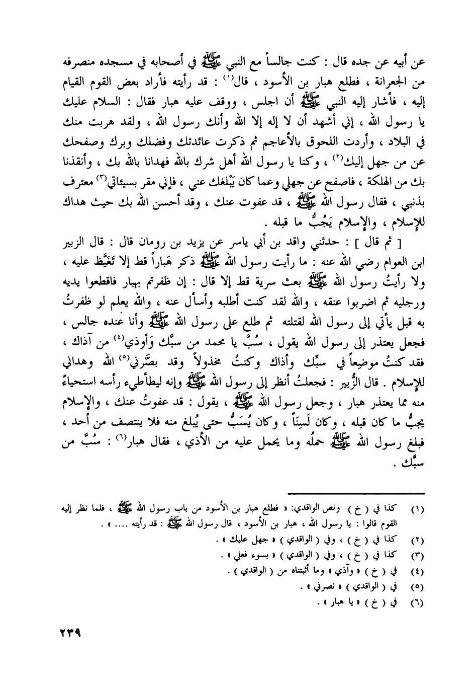 [ثم قال] : حدثني واقد بن أبي ياسر عن يزيد بن رومان قال: قال الزبير ابن العوام رضي اللَّه عنه: ما رأيت رسول اللَّه صلّى اللَّه عليه وسلّم ذكر هبارا قط إلا تغيّظ عليه، ولا رأيت رسول اللَّه صلّى اللَّه عليه وسلّم بعث سرية قط إلا قال: إن ظفرتم بهبار فاقطعوا يديه ورجليه ثم اضربوا عنقه، واللَّه لقد كنت أطلبه وأسأل عنه، واللَّه يعلم لو ظفرت به قبل يأتي إلى رسول اللَّه لقتلته ثم طلع على رسول اللَّه صلّى اللَّه عليه وسلّم وأنا عنده جالس، فجعل يعتذر إلى رسول اللَّه يقول، سبّ يا محمد من سبّك وأوذي [ (4) ] من آذاك، فقد كنت موضعا في سبّك وأذاك وكنت مخذولا وقد بصّرني [ (5) ] اللَّه وهداني للإسلام. قال الزّبير: فجعلت انظر إلى رسول اللَّه صلّى اللَّه عليه وسلّم وإنه ليطأطئ رأسه استحياء منه مما يعتذر هبار، وجعل رسول اللَّه صلّى اللَّه عليه وسلّم، يقول: قد عفوت عنك، والإسلام يجبّ ما كان قبله،