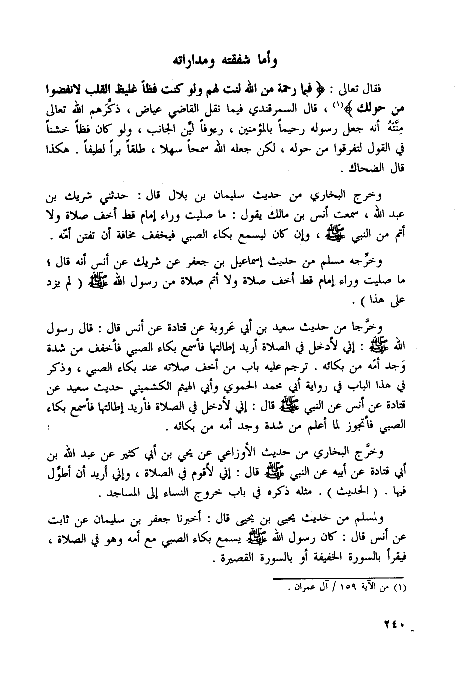 وخرج البخاري من حديث سليمان بن بلال قال: حدثني شريك بن عبد اللَّه، سمعت أنس بن مالك يقول: ما صليت وراء إمام قط أخف صلاة ولا أتم من النبي صلّى اللَّه عليه وسلّم، وإن كان ليسمع بكاء الصبي فيخفف مخافة أن تفتن أمّه.