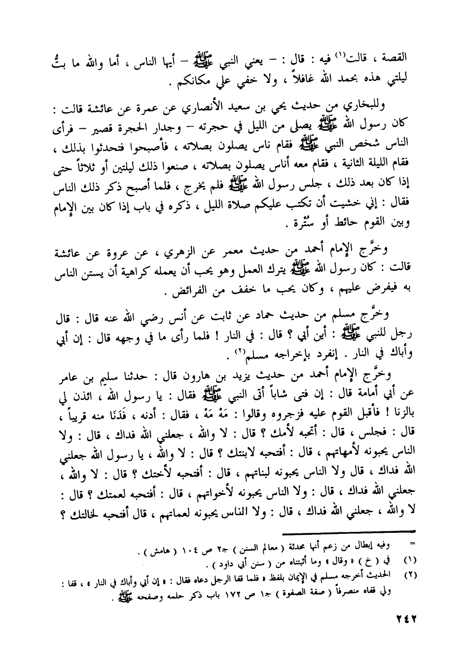 وخرّج الإمام أحمد من حديث يزيد بن هارون قال: حدثنا سليم بن عامر عن أبي أمامة قال: إن فتى شابا أتى النبي صلّى اللَّه عليه وسلّم فقال: يا رسول اللَّه، ائذن لي بالزنا! فأقبل القوم عليه فزجروه وقالوا: مه مه، فقال: أدنه، فدنا منه قريبا، قال: فجلس، قال: أتحبه لأمك؟ قال: لا واللَّه، جعلني اللَّه فداك، قال: ولا الناس يحبونه لأمهاتهم، قال: أفتحبه لابنتك؟ قال: لا واللَّه، يا رسول اللَّه جعلني اللَّه فداك، قال ولا الناس يحبونه لبناتهم، قال: أفتحبه لأختك؟ قال: لا واللَّه، جعلني اللَّه فداك، قال: ولا الناس يحبونه لأخواتهم، قال: أفتحبه لعمتك؟ قال: