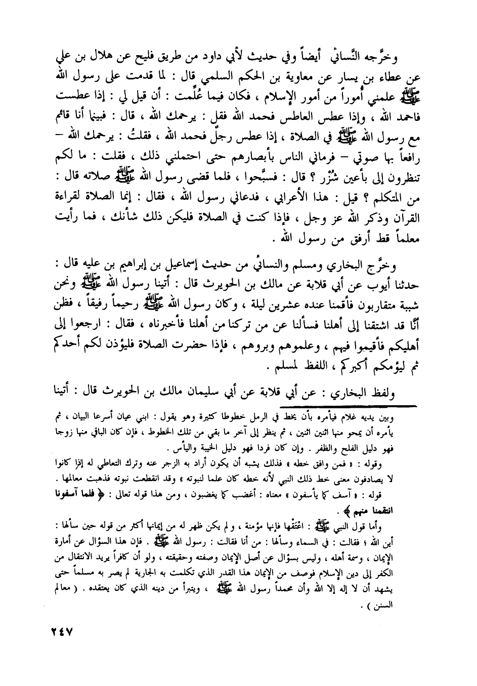 وخرّجه النّسائي أيضا وفي حديث لأبي داود من طريق فليح عن هلال بن علي عن عطاء بن يسار عن معاوية بن الحكم السلمي قال: لما قدمت على رسول اللَّه صلّى اللَّه عليه وسلّم علمني أمورا من أمور الإسلام، فكان فيما علّمت: أن قيل لي: إذا عطست فاحمد اللَّه، وإذا عطس العاطس فحمد اللَّه فقل: يرحمك اللَّه، قال: فبينما أنا قائم مع رسول اللَّه صلّى اللَّه عليه وسلّم في الصلاة، إذا عطس رجل فحمد اللَّه، فقلت: يرحمك اللَّه- رافعا بها صوتي- فرماني الناس بأبصارهم حتى احتملني ذلك، فقلت: ما لكم تنظرون إلى بأعين شزر؟ قال: فسبّحوا، فلما قضى رسول اللَّه صلّى اللَّه عليه وسلّم صلاته قال: