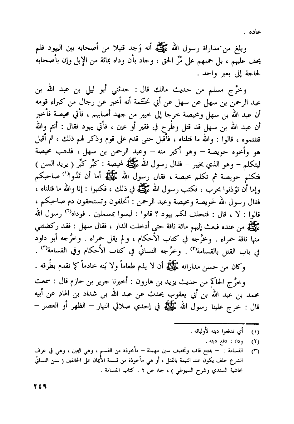 وخرّج مسلم من حديث مالك قال: حدثني أبو ليلي بن عبد اللَّه بن عبد الرحمن بن سهل عن سهل عن أبي خنتمة أنه أخبر عن رجال من كبراء قومه أن عبد اللَّه بن سهل ومحيصة خرجا إلى خيبر من جهد أصابهم، فأتي محيصة فأخبر أن عبد اللَّه بن سهل قد قتل وطرح في فقير أو عين، فأتي يهود فقال: أنتم واللَّه قتلتموه، قالوا: واللَّه ما قتلناه، فأقبل حتى قدم على قوم وذكر لهم ذلك، ثم أقبل هو وأخوه حويصة- وهو أكبر منه- وعبد الرحمن بن سهل، فذهب محيصة ليتكلم- وهو الّذي بخيبر- فقال رسول اللَّه صلّى اللَّه عليه وسلّم لمحيصة: كبّر كبّر (يريد السن) فتكلم حويصة ثم تكلم محيصة، فقال رسول اللَّه صلّى اللَّه عليه وسلّم أما أن تدوا [ (1) ] صاحبكم وإما أن تؤذنوا بحرب، فكتب رسول اللَّه صلّى اللَّه عليه وسلّم في ذلك، فكتبوا: إنا واللَّه ما قتلناه، فقال رسول اللَّه لحويصة ومحيصة وعبد الرحمن: أتحلفون وتستحقون دم صاحبكم، قالوا: لا، قال: فتحلف لكم يهود؟ قالوا: ليسوا بمسلمين. فوداه [ (2) ] رسول اللَّه صلّى اللَّه عليه وسلّم من عنده فبعث إليهم مائة ناقة حتى أدخلت الدار، فقال سهل: فقد ركضتني منها ناقة حمراء. وخرّجه في كتاب الأحكام، ولم يقل حمراء. وخرّجه أبو داود في باب القتل بالقسامة [ (3) ] . وخرّجه النسائي في كتاب الأحكام وفي القسامة [ (3) ] .