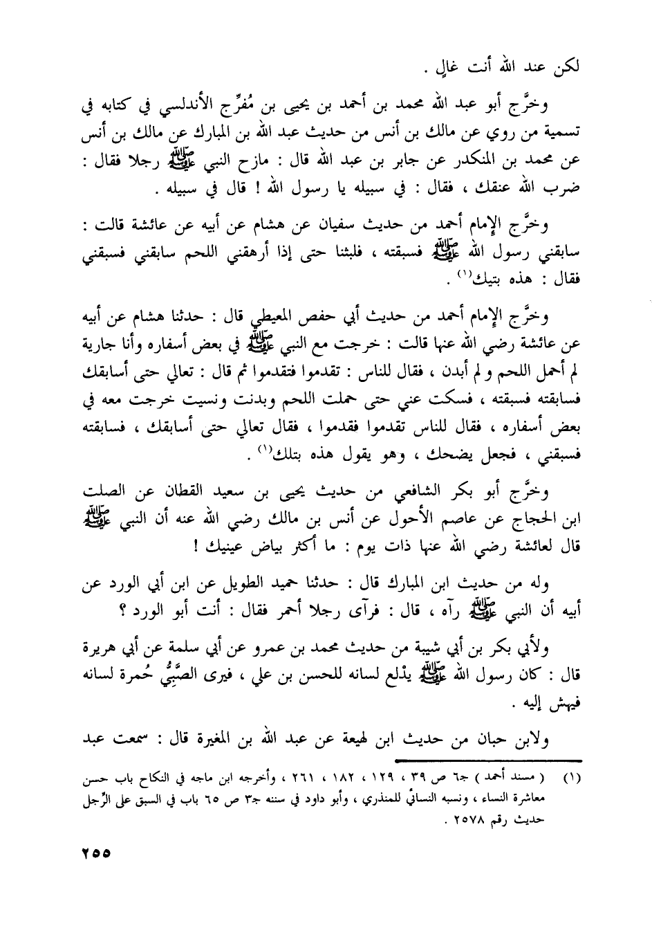 وخرّج الإمام أحمد من حديث أبي حفص المعيطي قال: حدثنا هشام عن أبيه عن عائشة رضي اللَّه عنها قالت: خرجت مع النبي صلّى اللَّه عليه وسلّم في بعض أسفاره وأنا جارية لم أحمل اللحم ولم أبدن، فقال للناس: تقدموا فتقدموا ثم قال: تعالي حتى أسابقك فسابقته فسبقته، فسكت عني حتى حملت اللحم وبدنت ونسيت خرجت معه في بعض أسفاره، فقال للناس تقدموا فقدموا، فقال تعالي حتى أسابقك، فسابقته فسبقني، فجعل يضحك، وهو يقول هذه بتلك [ (1) ] .