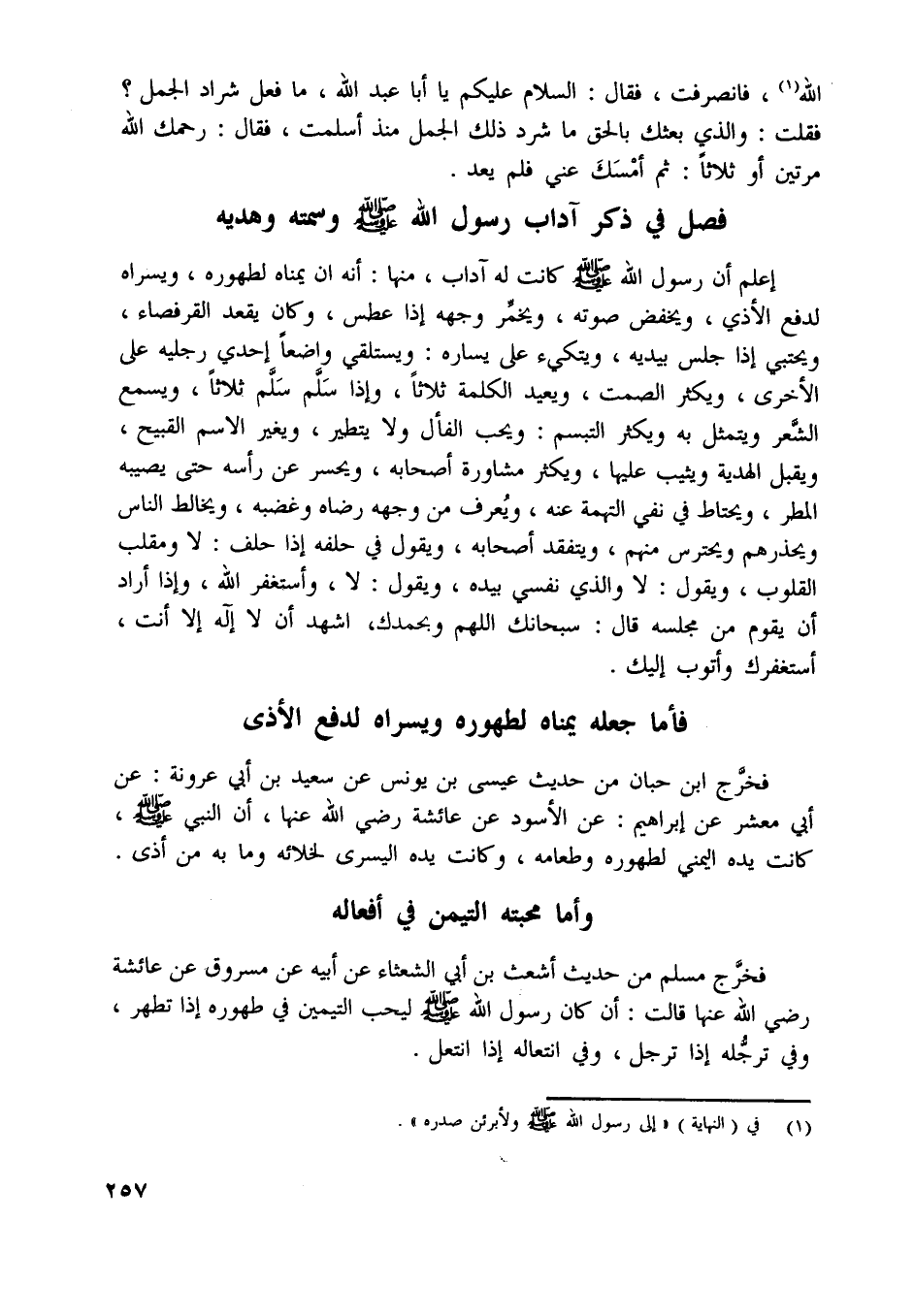 اعلم أن رسول اللَّه صلّى اللَّه عليه وسلّم كانت له آداب، منها: أنه ان يمناه لطهوره، ويسراه لدفع الأذى، ويخفض صوته، ويخمّر وجهه إذا عطس، وكان يقعد القرفصاء، ويحتبي إذا جلس بيديه، ويتكيء على يساره: ويستلقي واضعا إحدى رجليه على الأخرى، ويكثر الصمت، ويعيد الكلمة ثلاثا، وإذا سلّم سلّم ثلاثا، ويسمع الشّعر ويتمثل به ويكثر التبسم: ويحب الفأل ولا يتطير، ويغير الاسم القبيح، ويقبل الهدية ويثبت عليها، ويكثر مشاورة أصحابه، ويحسر عن رأسه حتى يصيبه المطر، ويحتاط في نفي التهمة عنه، ويعرف من وجهه رضاه وغضبه، ويخالط الناس ويحذرهم ويحترس منهم، ويتفقد أصحابه،