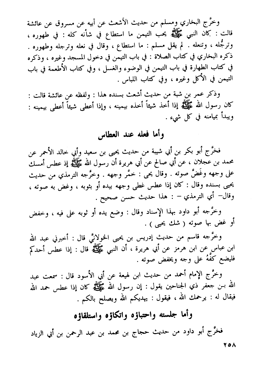 وخرّج البخاري ومسلم من حديث الأشعث عن أبيه عن مسروق عن عائشة قالت: كان النبي صلّى اللَّه عليه وسلّم يحب التيمن ما استطاع في شأنه كله: في طهوره، وترجّله، وتنعله. لم يقل مسلم: ما استطاع، وقال في نعله وترجله وطهوره.