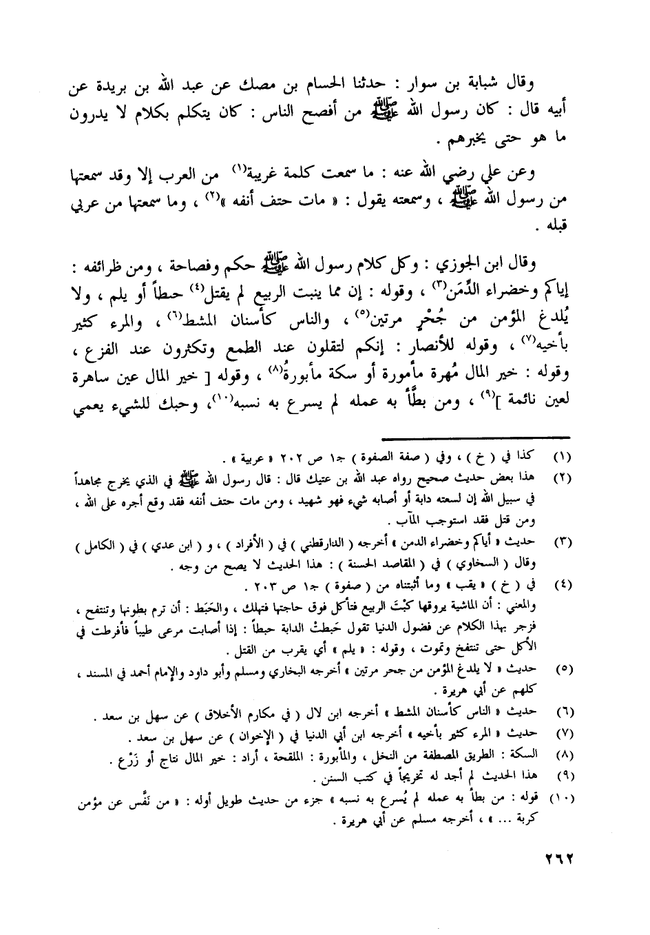 وقال ابن الجوزي: وكل كلام رسول اللَّه صلّى اللَّه عليه وسلّم حكم وفصاحة، ومن ظرائفه: