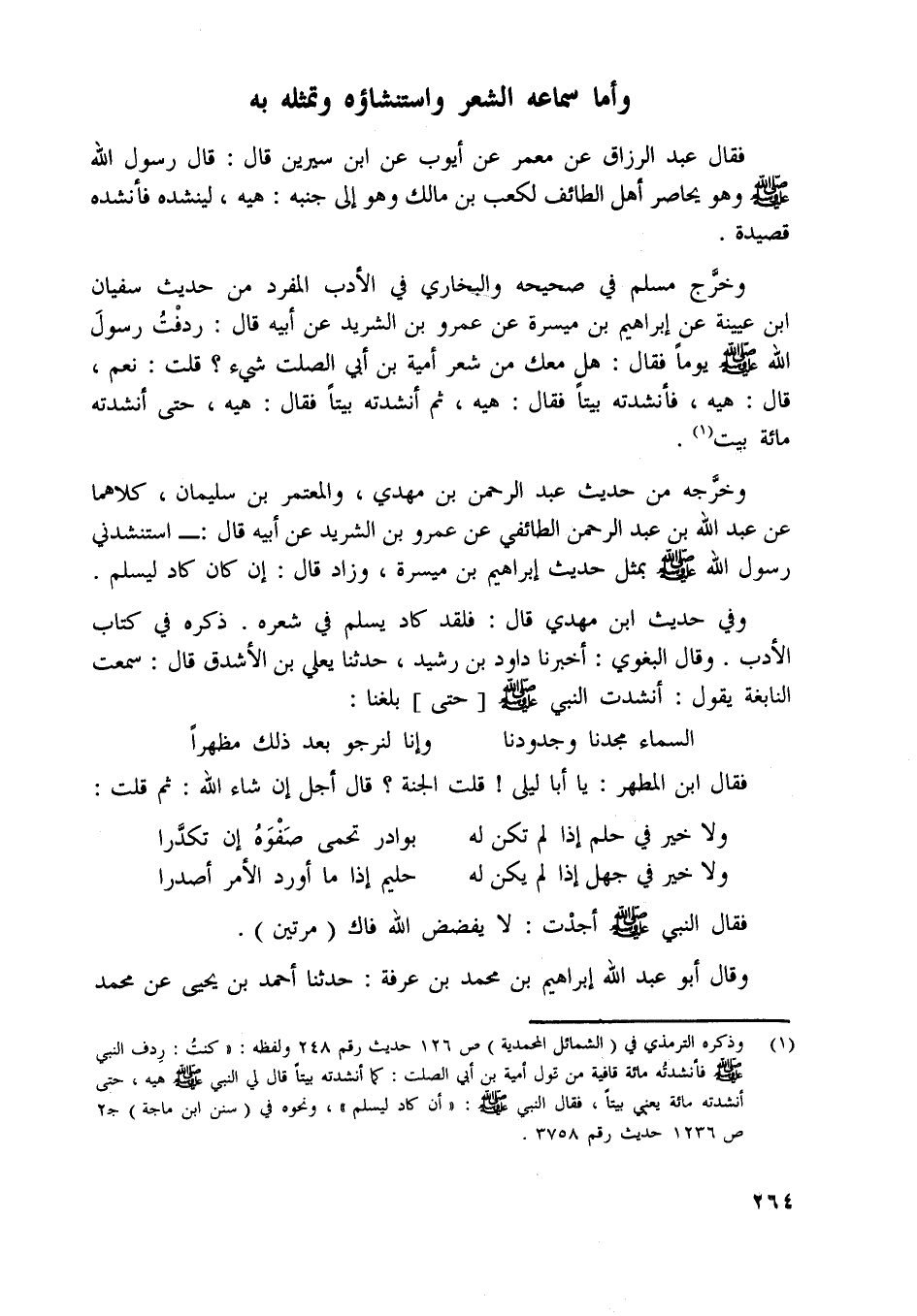 وخرّج مسلم في صحيحه والبخاري في الأدب المفرد من حديث سفيان ابن عيينة عن إبراهيم بن ميسرة عن عمرو بن الشريد عن أبيه قال: ردفت رسول اللَّه صلّى اللَّه عليه وسلّم يوما فقال: هل معك من شعر أمية بن أبي الصلت شيء؟ قلت: نعم، قال: هيه، فأنشدته بيتا فقال: هيه، ثم أنشدته بيتا فقال: هيه، حتى أنشدته مائة بيت [ (1) ] .