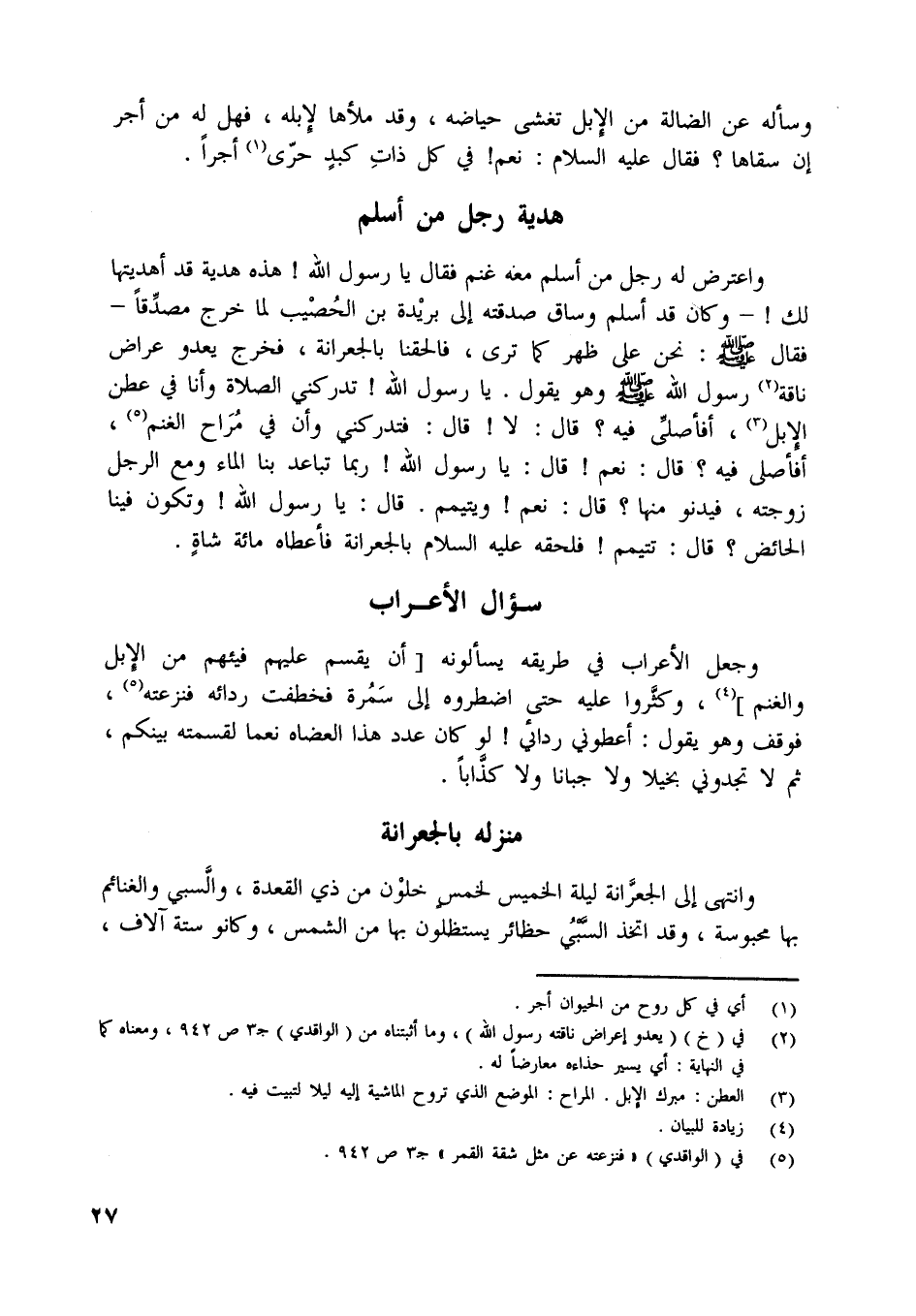 واعترض له رجل من أسلم معه غنم فقال يا رسول اللَّه! هذه هدية قد أهديتها لك! - وكان قد أسلم وساق صدقته إلى بريدة بن الحصيب لما خرج مصدّقا- فقال صلى اللَّه عليه وسلّم: نحن على ظهر كما ترى، فالحقنا بالجعرانة، فخرج يعدو عراض ناقة [ (2) ] رسول اللَّه صلى اللَّه عليه وسلّم وهو يقول. يا رسول اللَّه! تدركني الصلاة وأنا في عطن الإبل [ (3) ] ، أفأصلّى فيه؟ قال: لا! قال: فتدركني وأن في مراح الغنم [ (4) ] ، أفأصلي فيه؟ قال: نعم! قال: يا رسول اللَّه! ربما تباعد بنا الماء ومع الرجل زوجته، فيدنو منها؟ قال: نعم! ويتيمم. قال: يا رسول اللَّه! وتكون فينا الحائض؟ قال: تتيمم! فلحقه عليه السلام بالجعرانة فأعطاه مائة شاة.