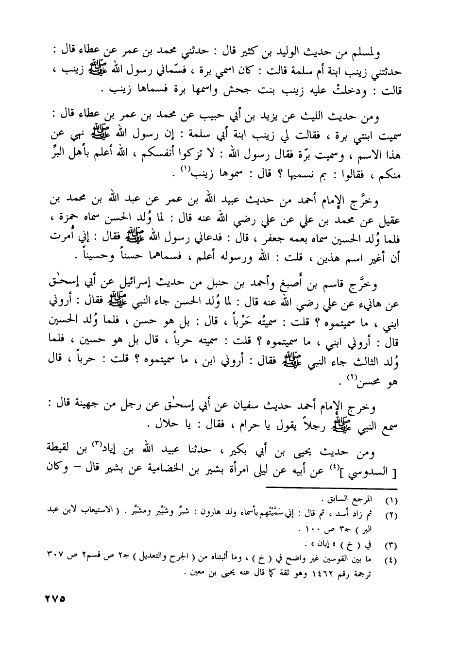 حدثتني زينب ابنة أم سلمة قالت: كان اسمي برة، فسمّاني رسول اللَّه صلّى اللَّه عليه وسلّم زينب، قالت: ودخلت عليه زينب بنت جحش واسمها برة فسماها زينب.