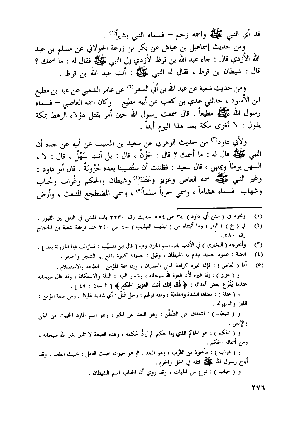 وغير النبي صلّى اللَّه عليه وسلّم اسمه العاص وعزيز وعتلة [ (4) ] وشيطان والحكم وغراب وحباب وشهاب فسماه هشاما، وسمي حربا سلما [ (5) ] ، وسمي المضطجع المنبعث، وأرض