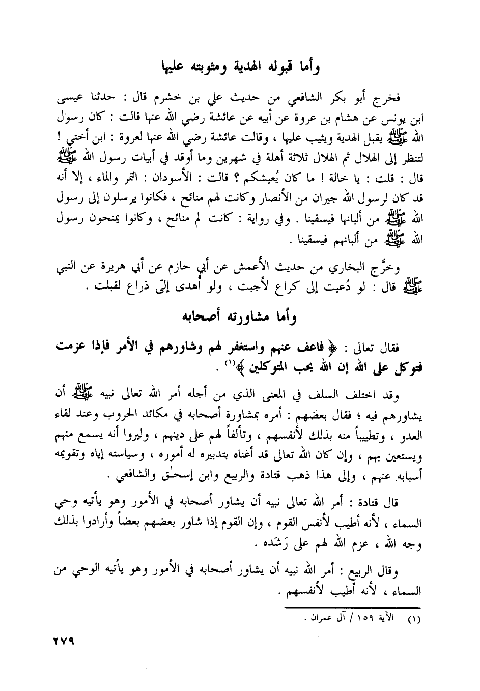 فخرج أبو بكر الشافعيّ من حديث علي بن خشرم قال: حدثنا عيسى ابن يونس عن هشام بن عروة عن أبيه عن عائشة رضي اللَّه عنها قالت: كان رسول اللَّه صلّى اللَّه عليه وسلّم يقبل الهدية ويثيب عليها، وقالت عائشة رضي اللَّه عنها لعروة: ابن أختي! لتنظر إلى الهلال ثم الهلال ثلاثة أهلة في شهرين وما أوقد في أبيات رسول اللَّه صلّى اللَّه عليه وسلّم قال: قلت: يا خالة! ما كان يعيشكم؟ قالت: الأسودان: التمر والماء، إلا أنه قد كان لرسول اللَّه جيران من الأنصار وكانت لهم منائح، فكانوا يرسلون إلى رسول اللَّه صلّى اللَّه عليه وسلّم من ألبانها فيسقينا. وفي رواية: كانت لم منائح، وكانوا يمنحون رسول اللَّه صلّى اللَّه عليه وسلّم من ألبانهم فيسقينا.