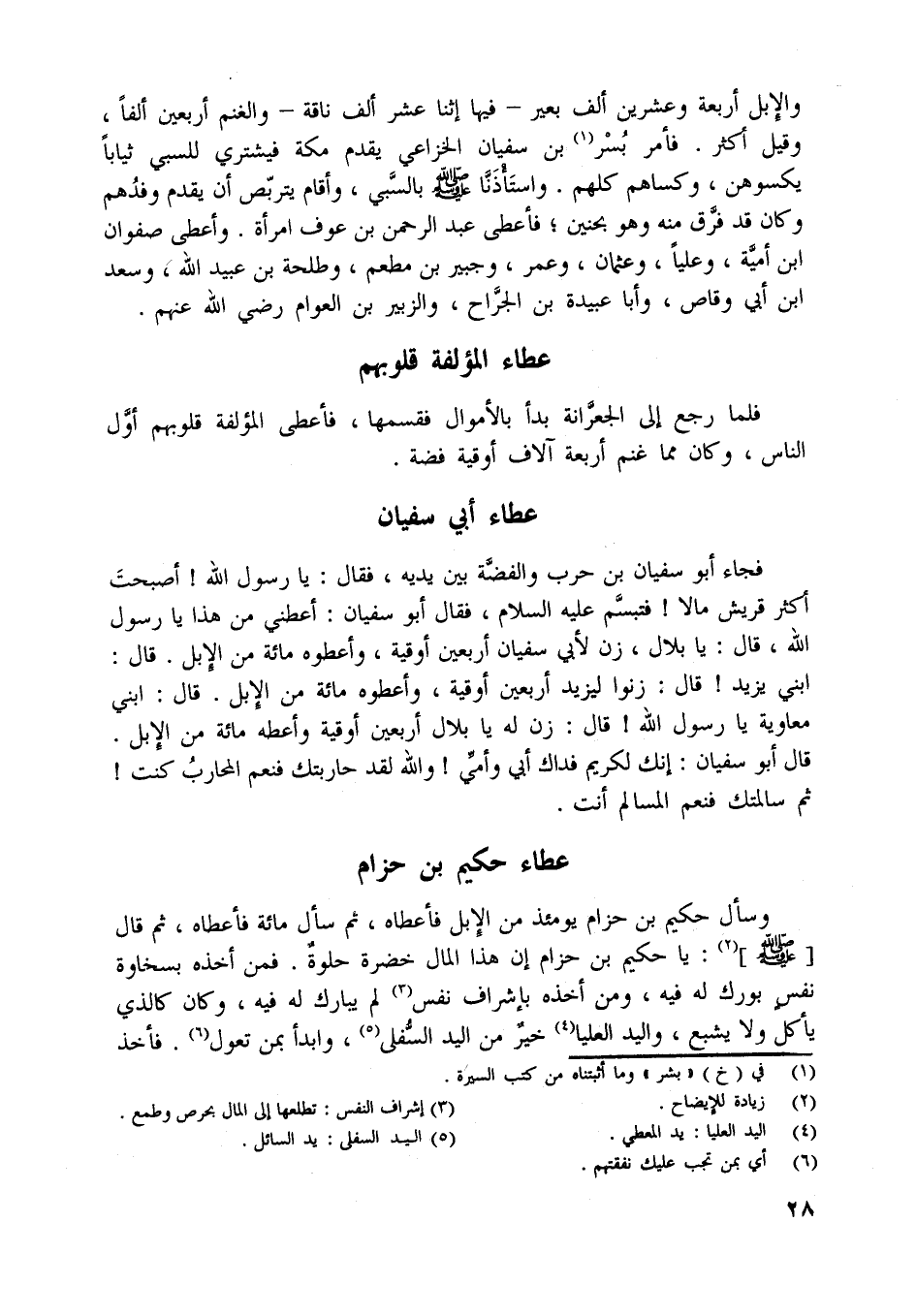 وسأل حكيم بن حزام يومئذ من الإبل فأعطاه، ثم سأل مائة فأعطاه، ثم قال [صلى اللَّه عليه وسلّم] [ (2) ] : يا حكيم بن حزام إن هذا المال خضرة حلوة. فمن أخذه بسخاوة نفس بورك له فيه، ومن أخذه بإشراف نفس [ (3) ] لم يبارك له فيه، وكان كالذي يأكل ولا يشبع، واليد العليا [ (4) ] خير من اليد السّفلى [ (5) ] ، وابدأ بمن تعول [ (6) ] .