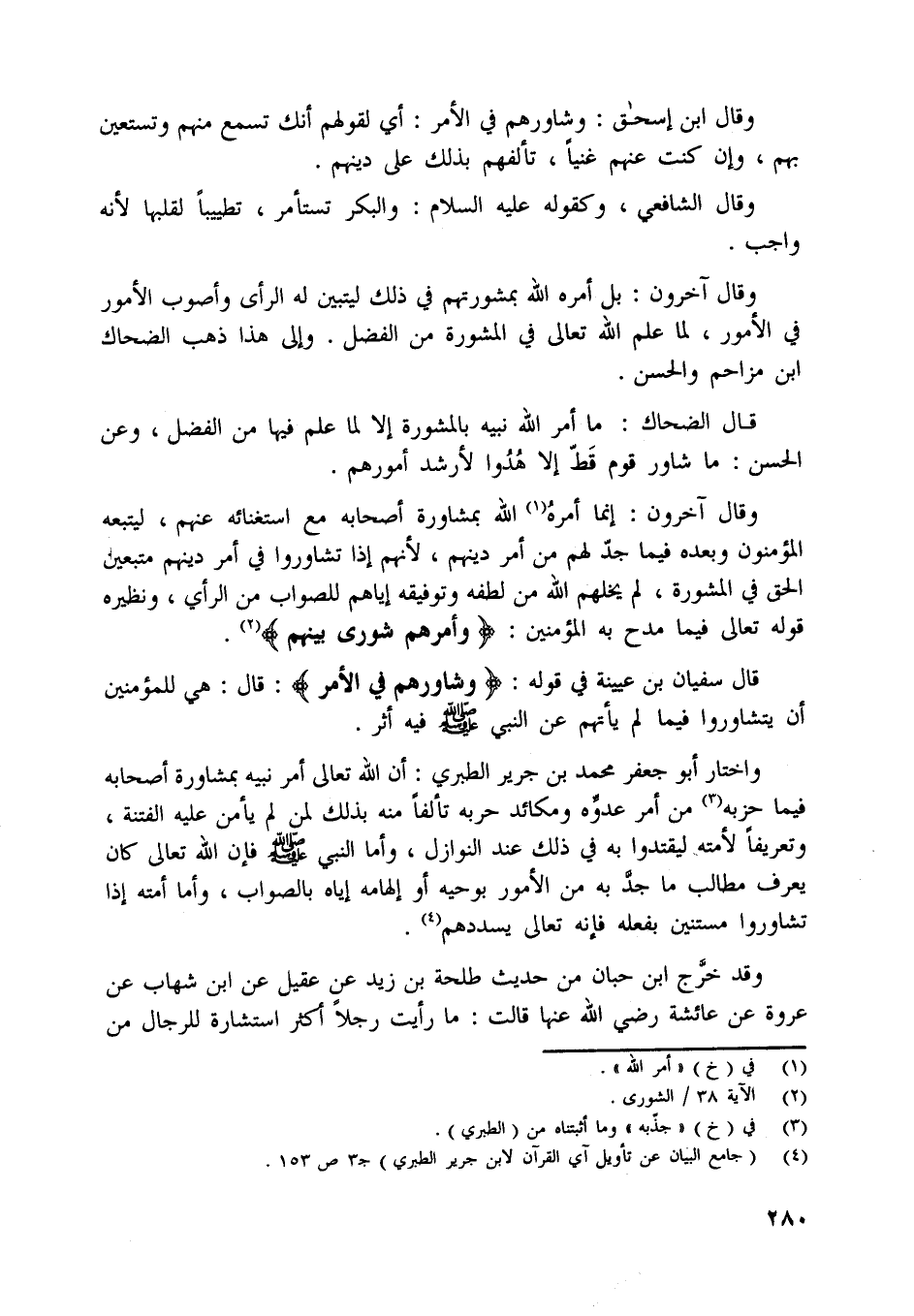 قال سفيان بن عيينة في قوله: وَشاوِرْهُمْ فِي الْأَمْرِ: قال: هي للمؤمنين أن يتشاوروا فيما لم يأتهم عن النبي صلّى اللَّه عليه وسلّم فيه أثر.