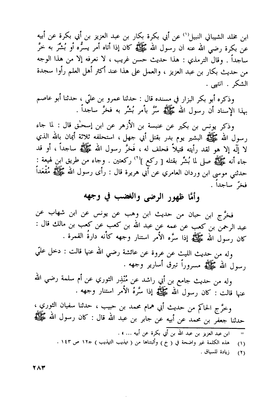 ابن مخلد الشيبانيّ النبيل [ (1) ] عن أبي بكرة بكار بن عبد العزيز بن أبي بكرة عن أبيه عن بكرة رضي اللَّه عنه ان رسول اللَّه صلّى اللَّه عليه وسلّم كان إذا أتاه أمر يسرّه أو بشّر به خرّ ساجدا. وقال الترمذي: هذا حديث حسن غريب، لا نعرفه إلا من هذا الوجه من حديث بكار بن عبد العزيز، والعمل على هذا عند أكثر أهل العلم رأوا سجدة الشكر. انتهى.