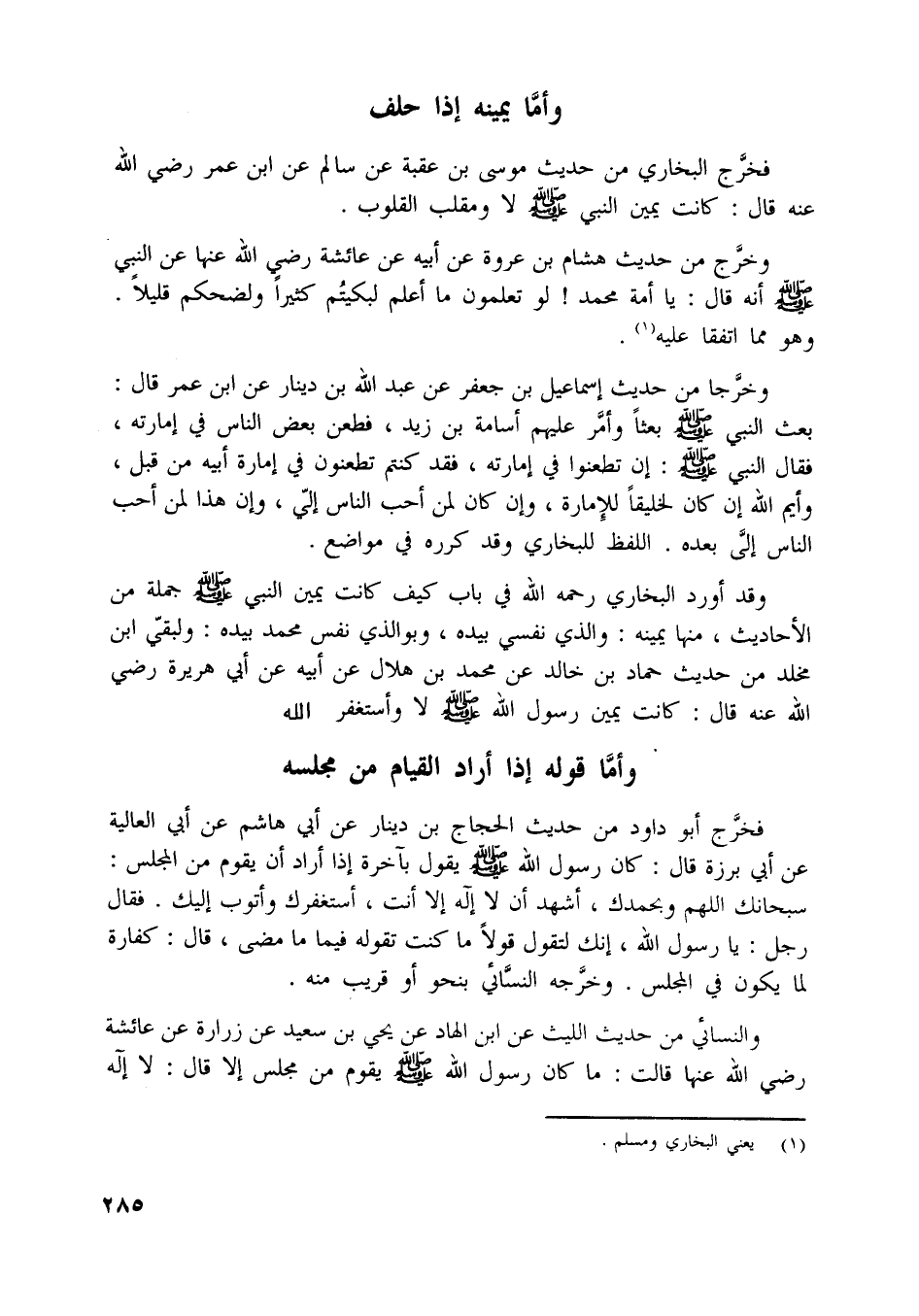 وقد أورد البخاري رحمه اللَّه في باب كيف كانت يمين النبي صلّى اللَّه عليه وسلّم جملة من الأحاديث، منها يمينه: والّذي نفسي بيده، وبو الذي نفس محمد بيده: ولبقي ابن مخلد من حديث حماد بن خالد عن محمد بن هلال عن أبيه عن أبي هريرة رضي اللَّه عنه قال: كانت يمين رسول اللَّه صلّى اللَّه عليه وسلّم لا وأستغفر اللَّه