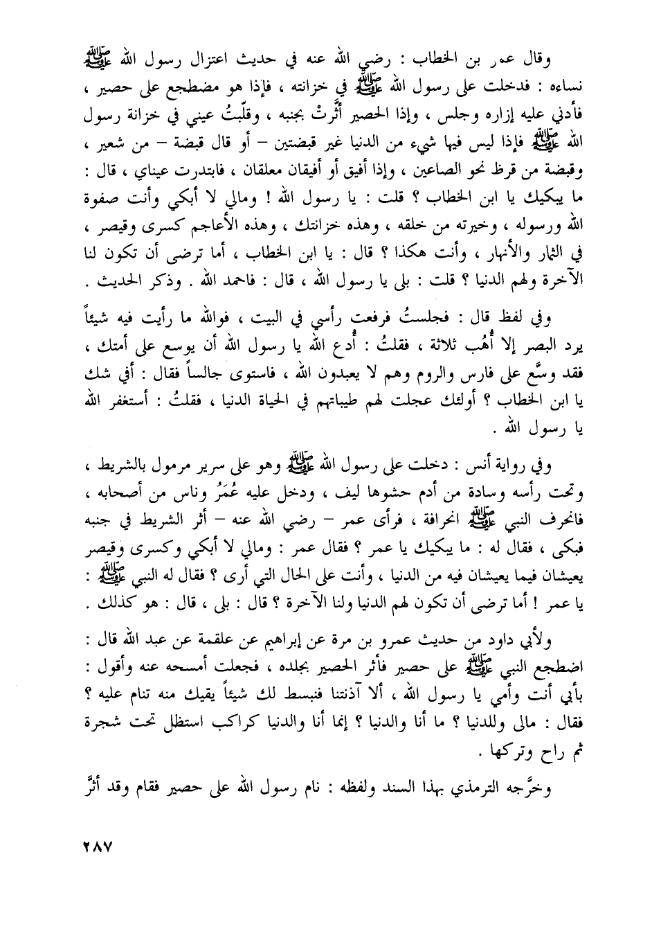 وقال عمر بن الخطاب: رضي اللَّه عنه في حديث اعتزال رسول اللَّه صلّى اللَّه عليه وسلّم نساءه: فدخلت على رسول اللَّه صلّى اللَّه عليه وسلّم في خزانته، فإذا هو مضطجع على حصير، فأدني عليه إزاره وجلس، وإذا الحصير أثّرت بجنبه، وقلّبت عيني في خزانة رسول اللَّه صلّى اللَّه عليه وسلّم فإذا ليس فيها شيء من الدنيا غير قبضتين- أو قال قبضة- من شعير، وقبضة من قرظ نحو الصاعين، وإذا أفيق أو أفيقان معلقان، فابتدرت عيناي، قال:
