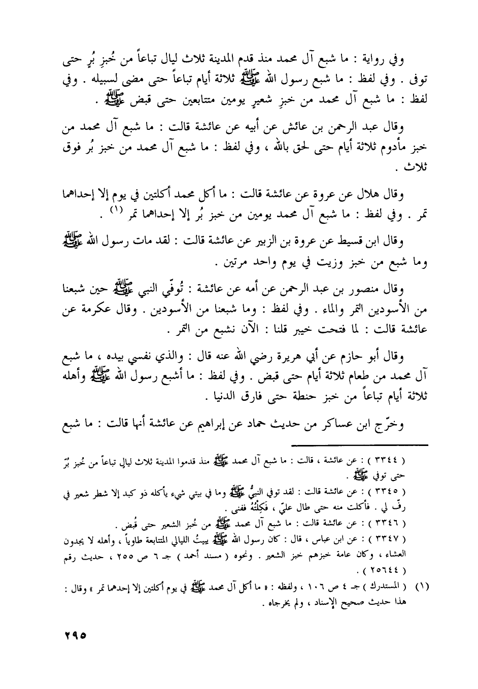 وفي رواية: ما شبع آل محمد منذ قدم المدينة ثلاث ليال تباعا من خبز بر حتى توفى. وفي لفظ: ما شبع رسول اللَّه صلّى اللَّه عليه وسلّم ثلاثة أيام تباعا حتى مضى لسبيله. وفي لفظ: ما شبع آل محمد من خبز شعير يومين متتابعين حتى قبض صلّى اللَّه عليه وسلّم.